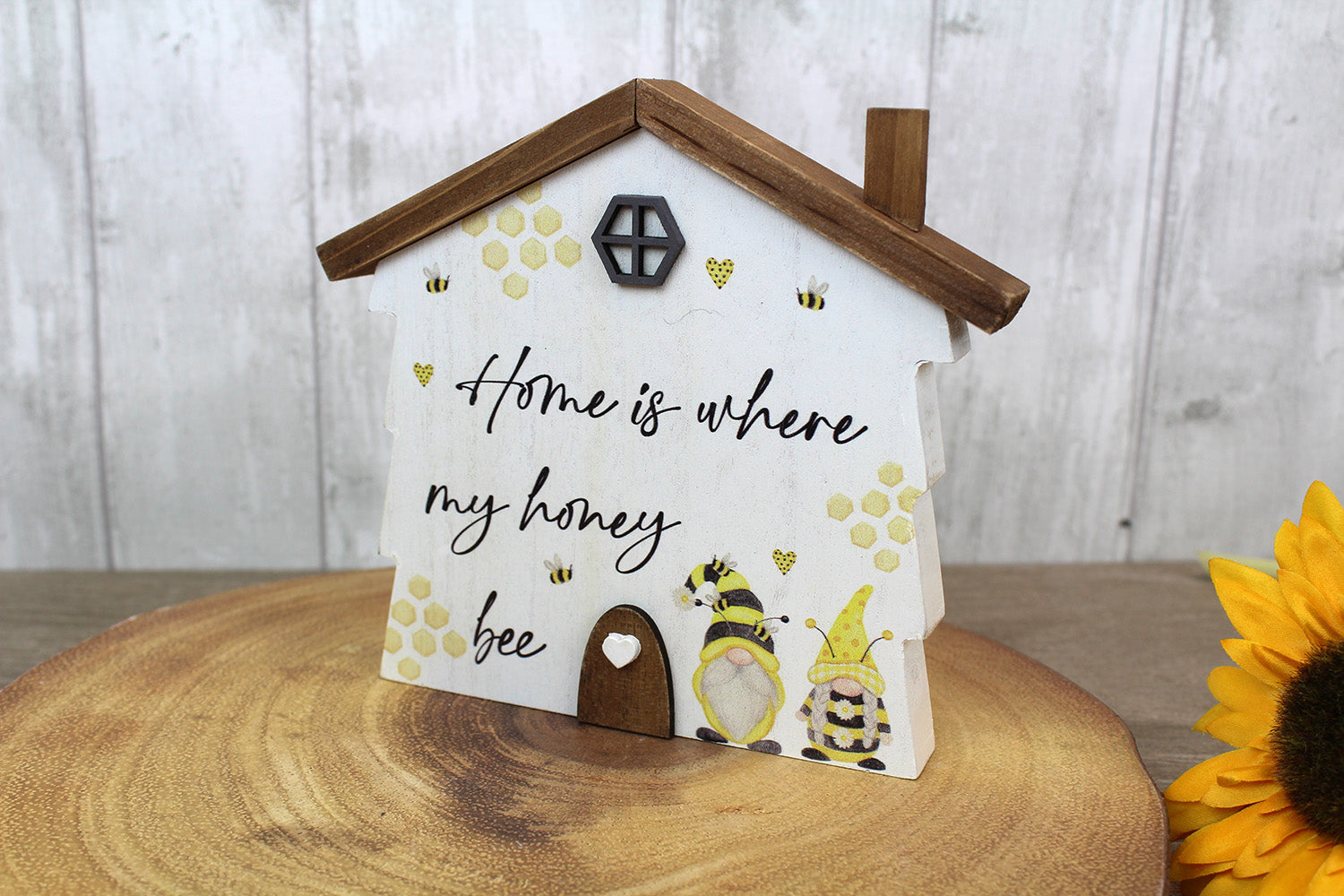 Gorgeous bee hive shaped wooden block with cute bee & gonk design. Slogan reads 'Home Is Where My Honey Bee'