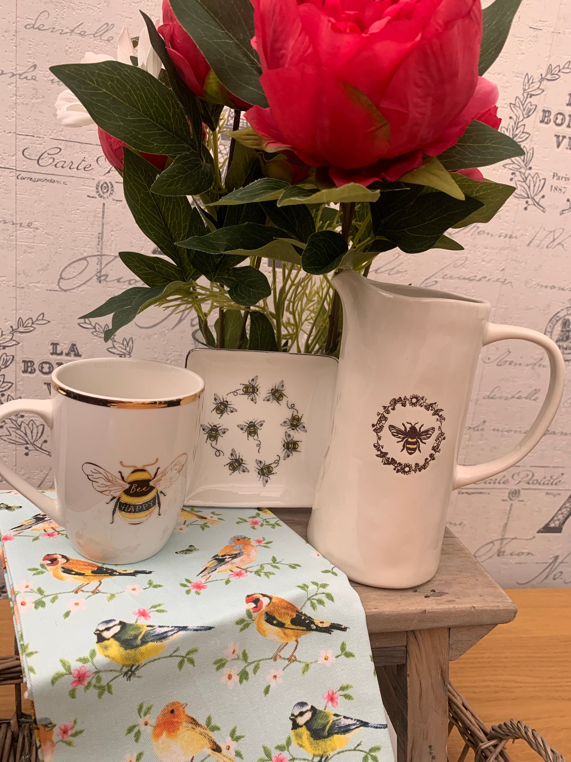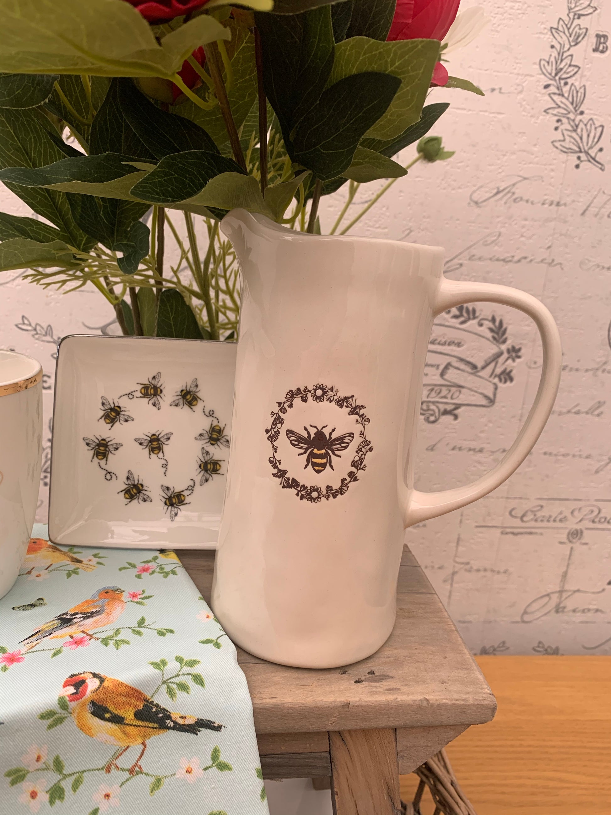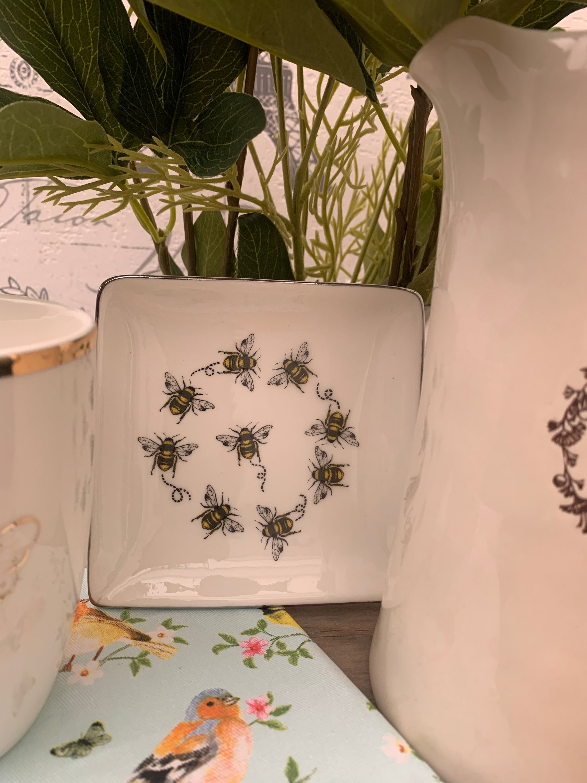 Gorgeously stylish but simple square ceramic trinket dish with bees design, very dressing table worthy for little pieces of jewellery or hair bands. Would not look out of place on a hall table or in the kitchen to hold your rings while washing up!