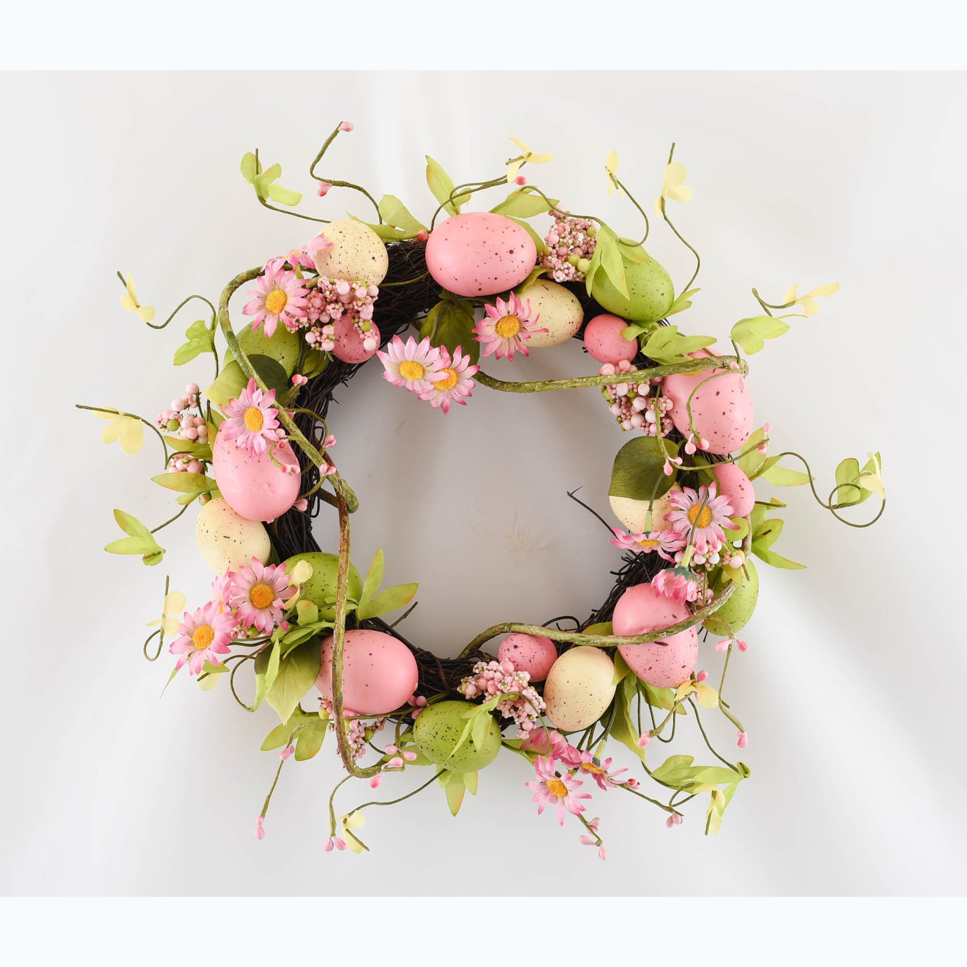 A pretty pastel coloured Spring wreath with artificial foliage and cute daisies. Complete with an assortment of speckled pastel coloured eggs.
