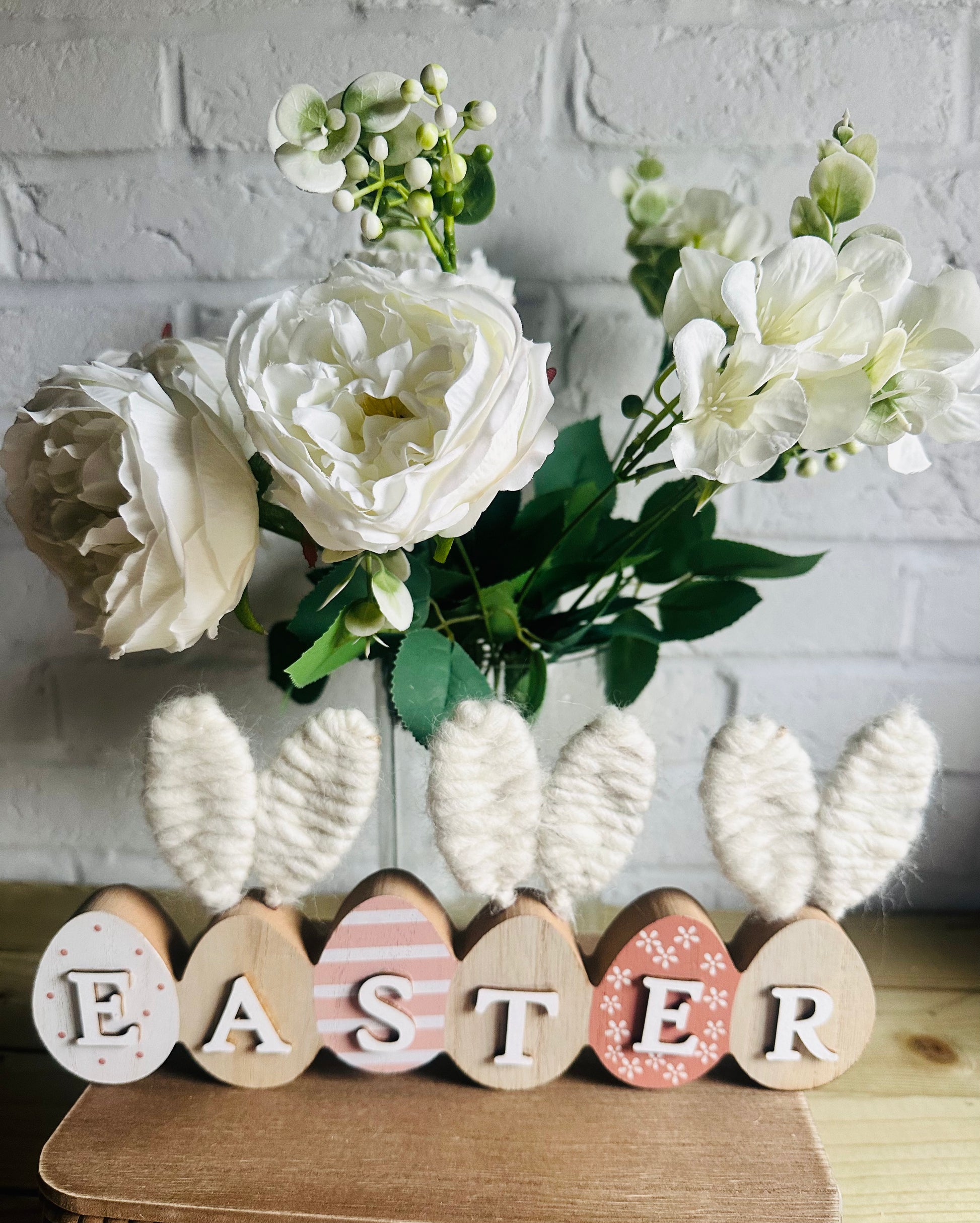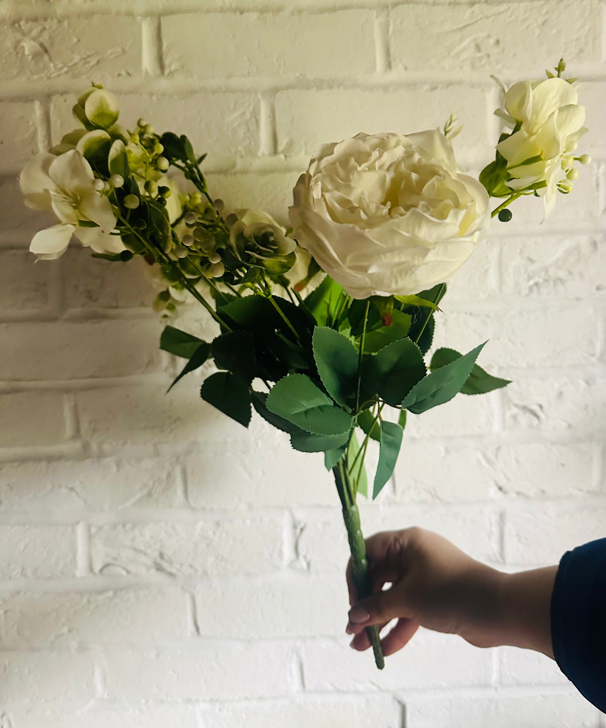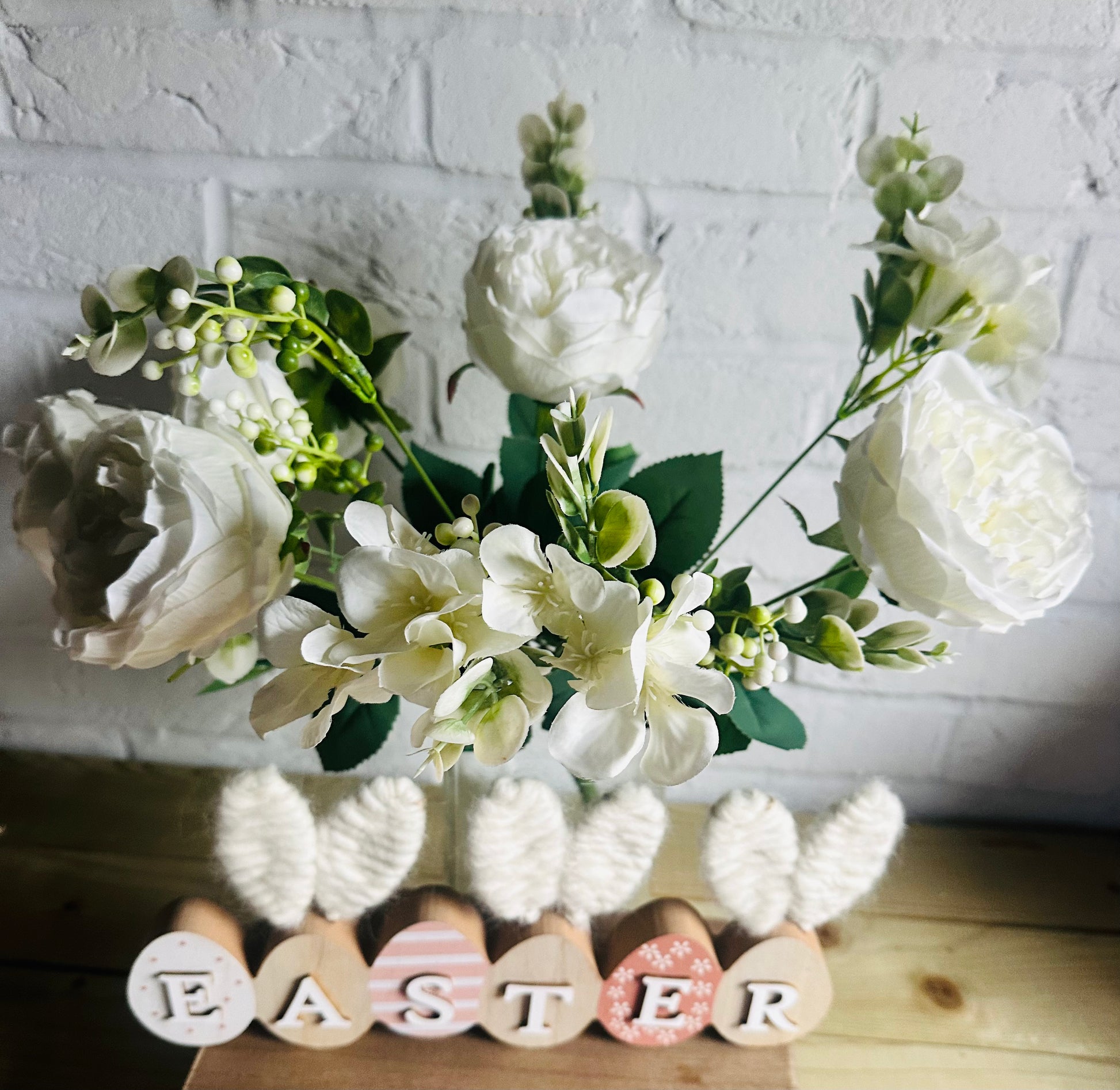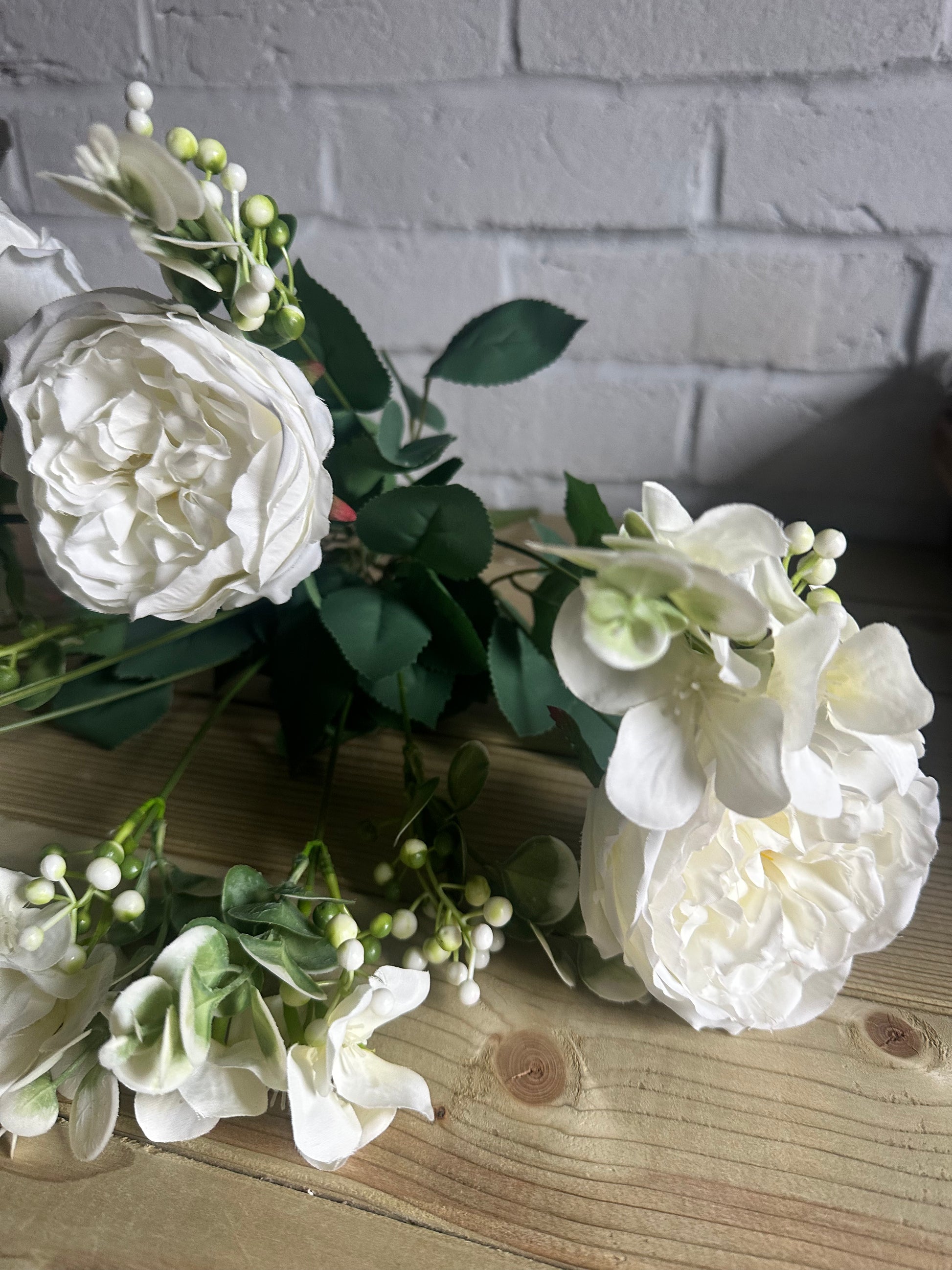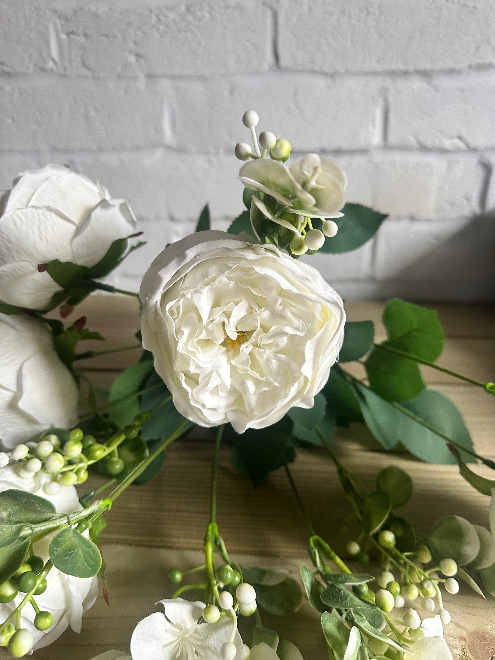 Beautiful ready made arrangement of faux white rose stems with contrasting green foliage, refresh your home this Spring and make these the focal point wherever you choose to display them.