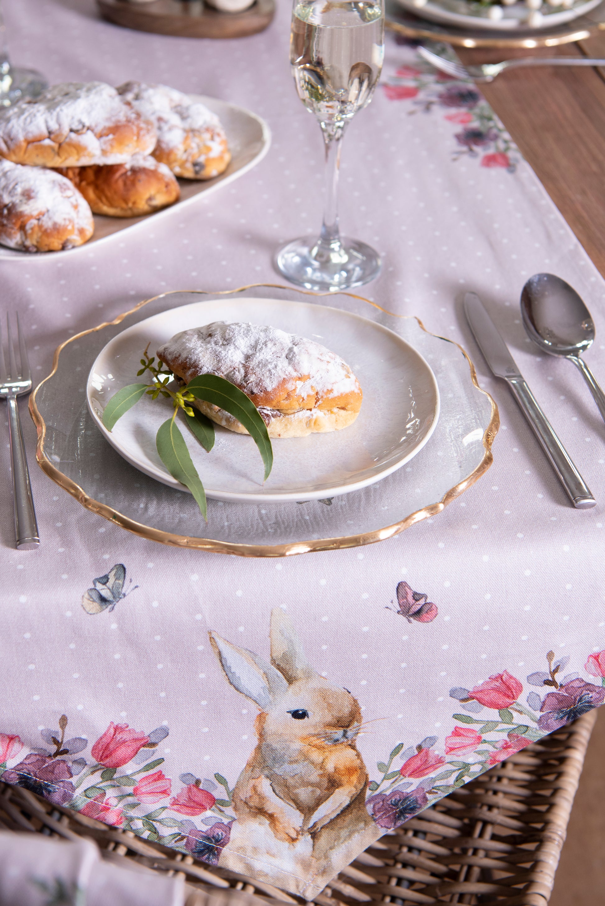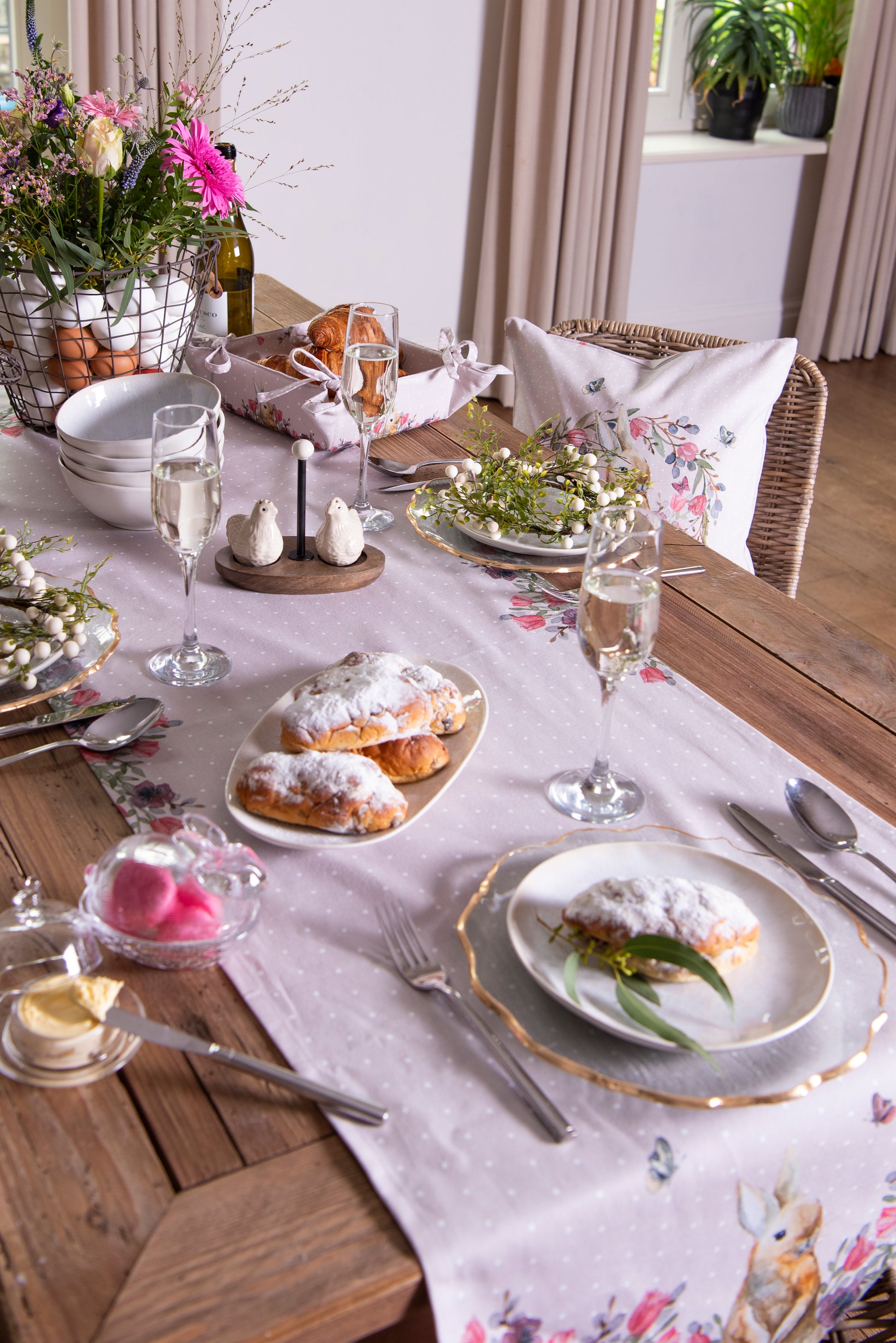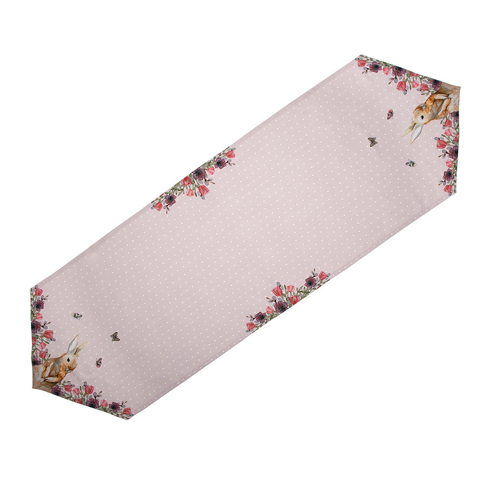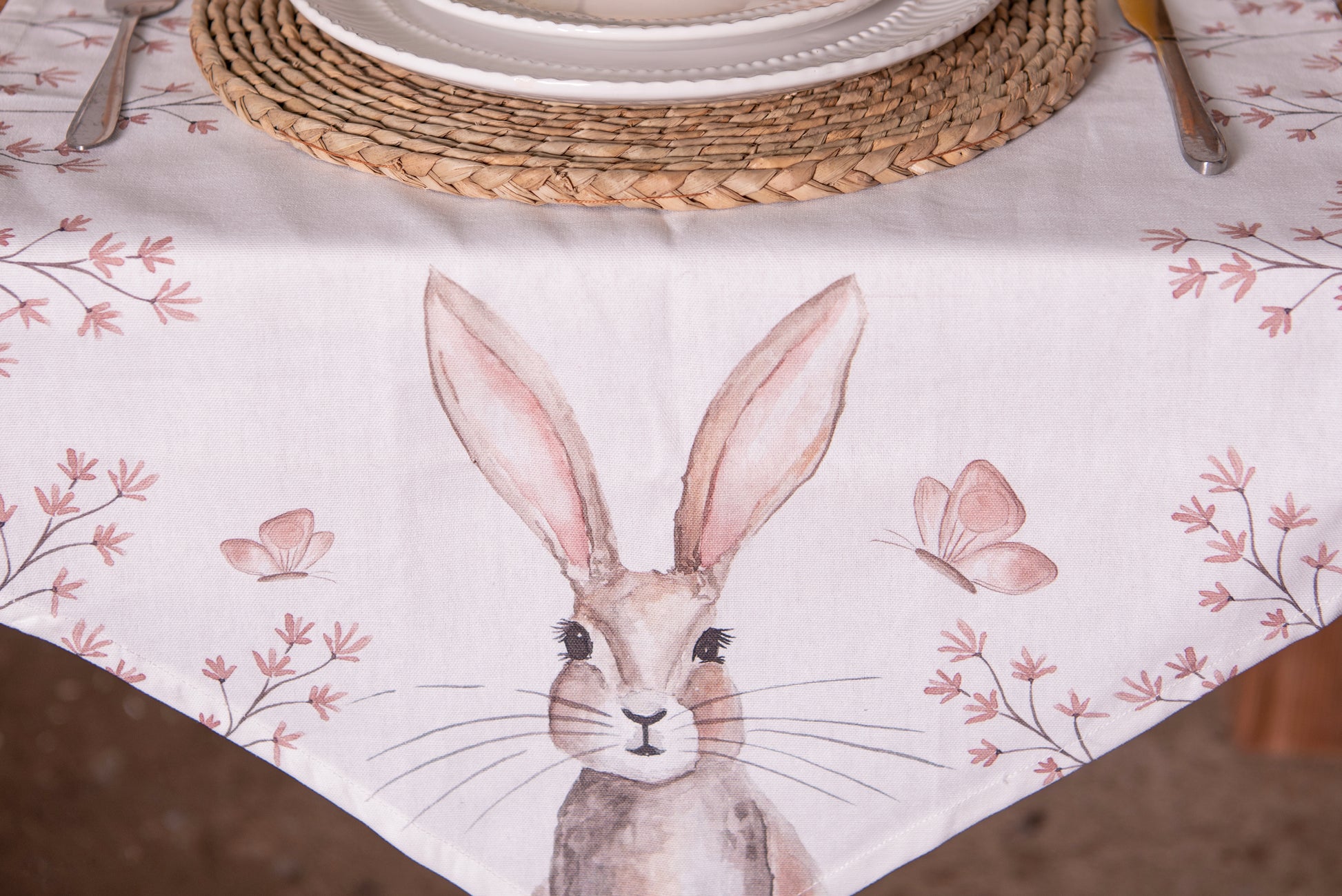 Beautiful rectangular table runners decorated with spring flowers and featuring a cute bunny.