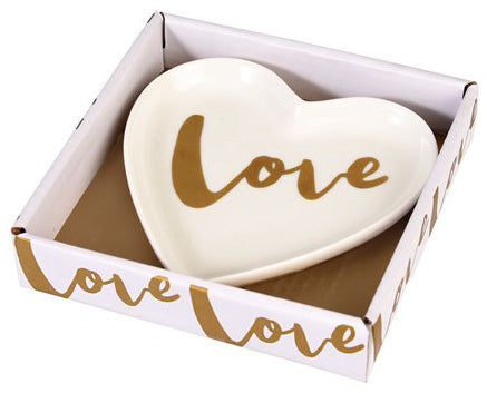 Small white ceramic heart shaped dish with 'love' written in gold across the middle
