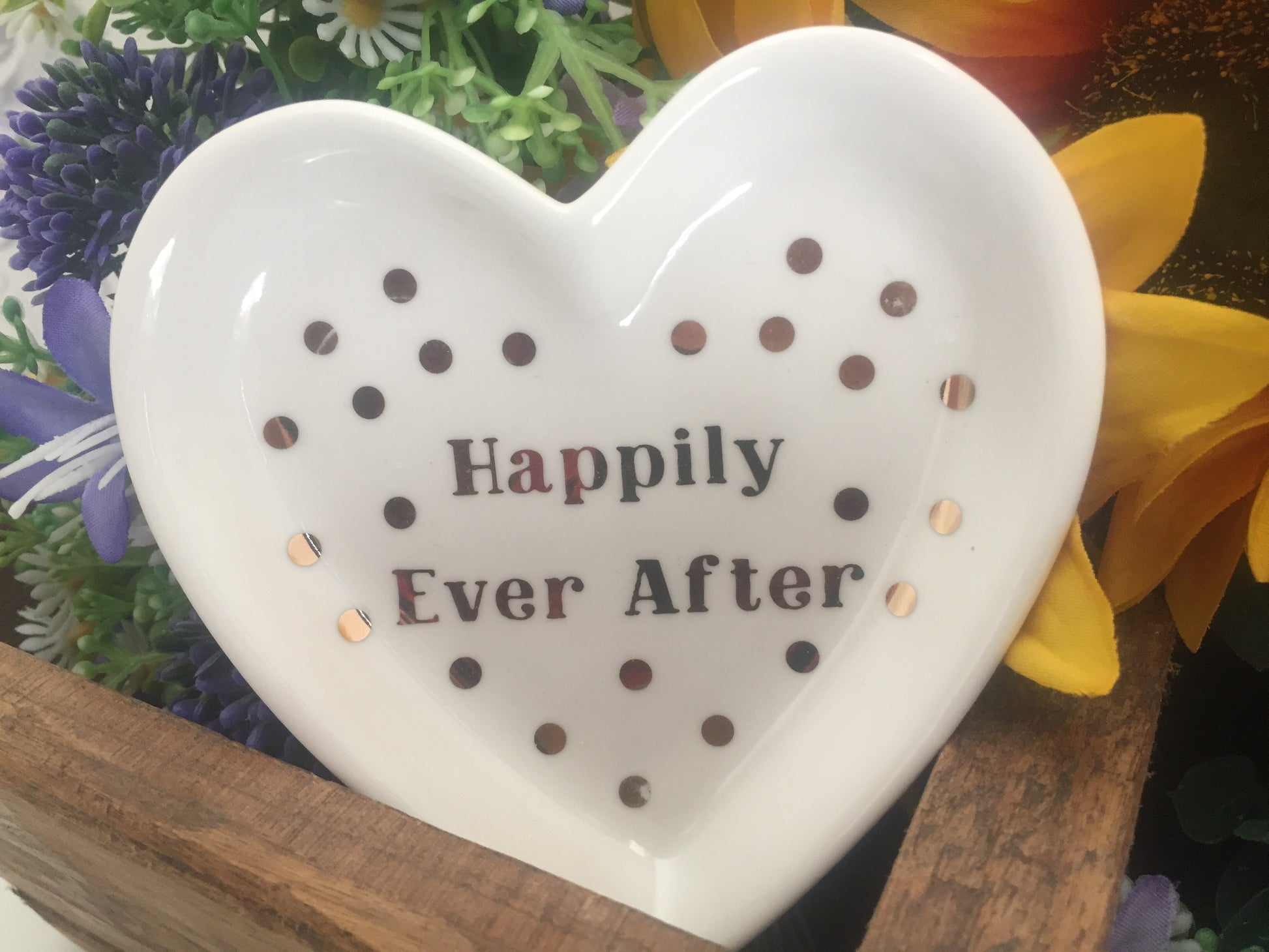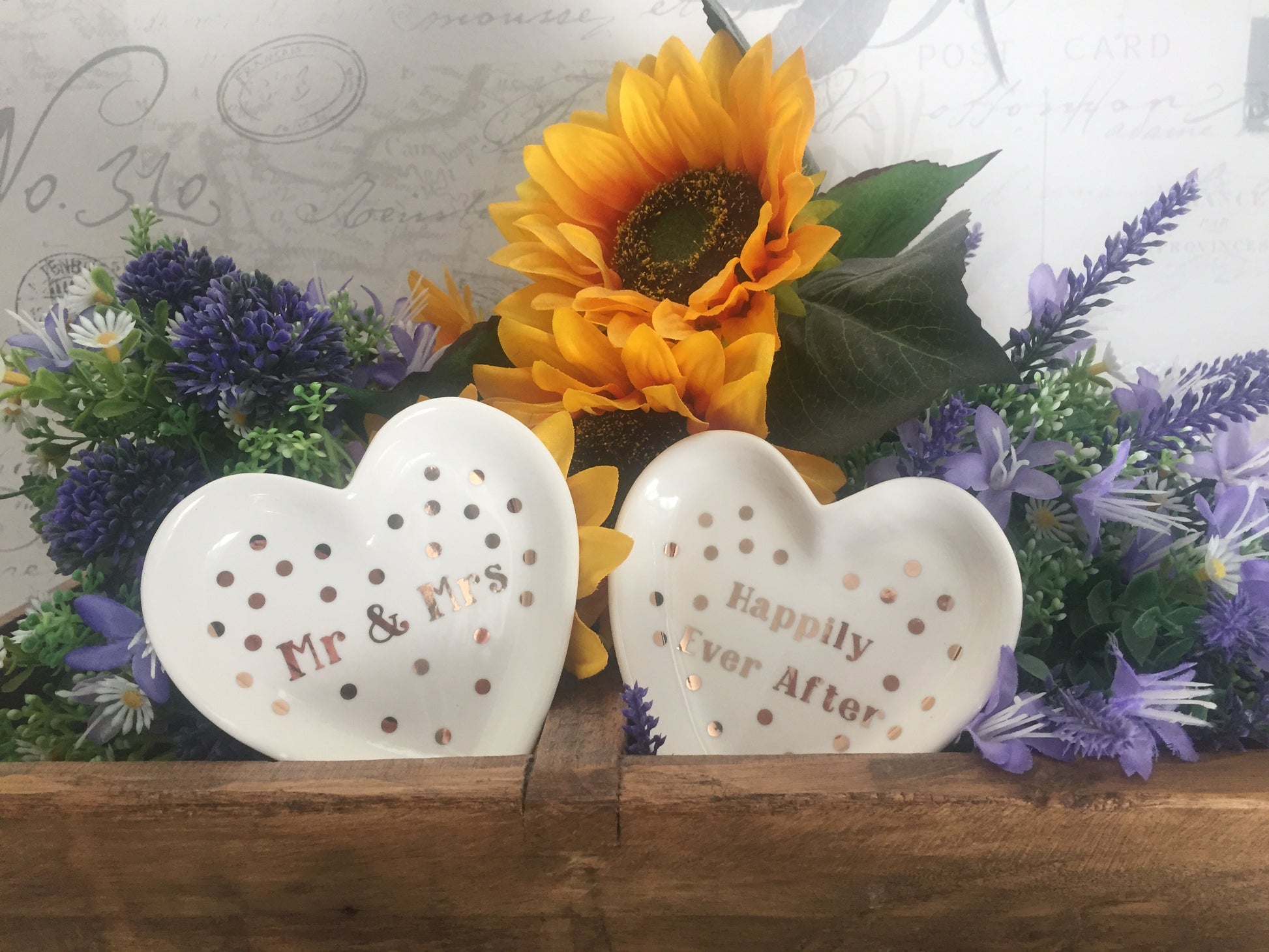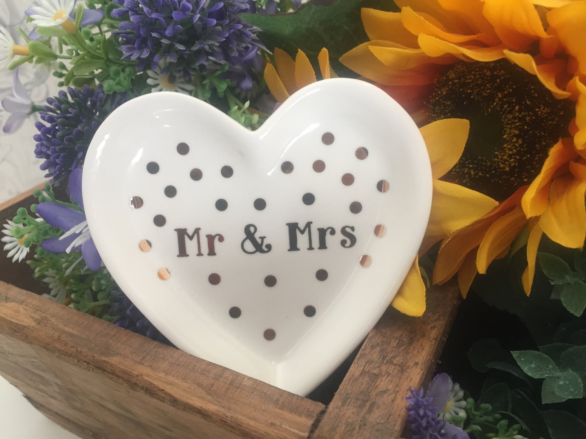 Small white ceramic heart shaped dish with 'Mr & Mrs' or ‘Happily Ever After’ written in gold across the middle along with a lovely dotty pattern.