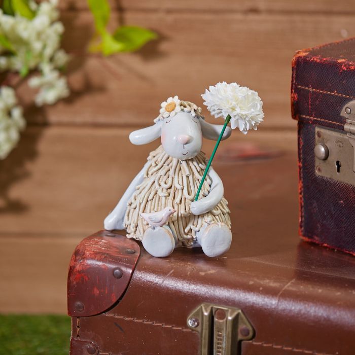 Add some cuteness to your living space with this utterly adorable medium sized textured  sitting sheep complete with flower & adorable bird pirched on her foot..