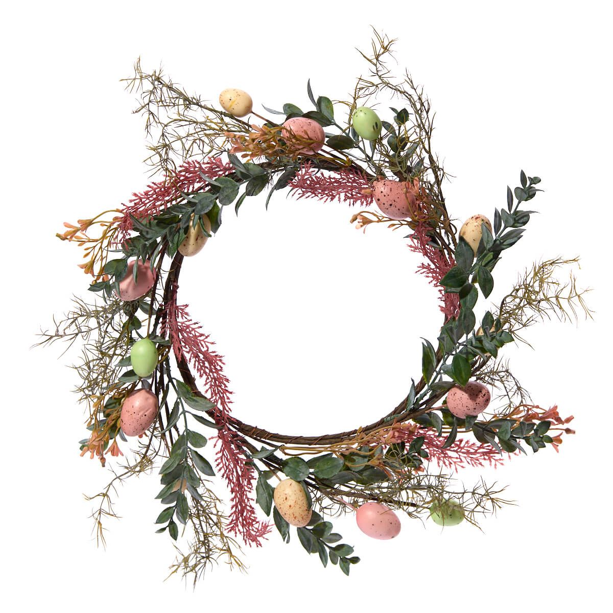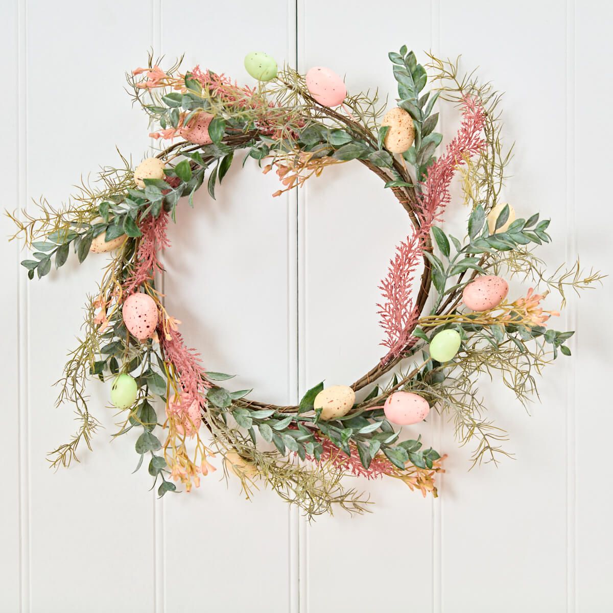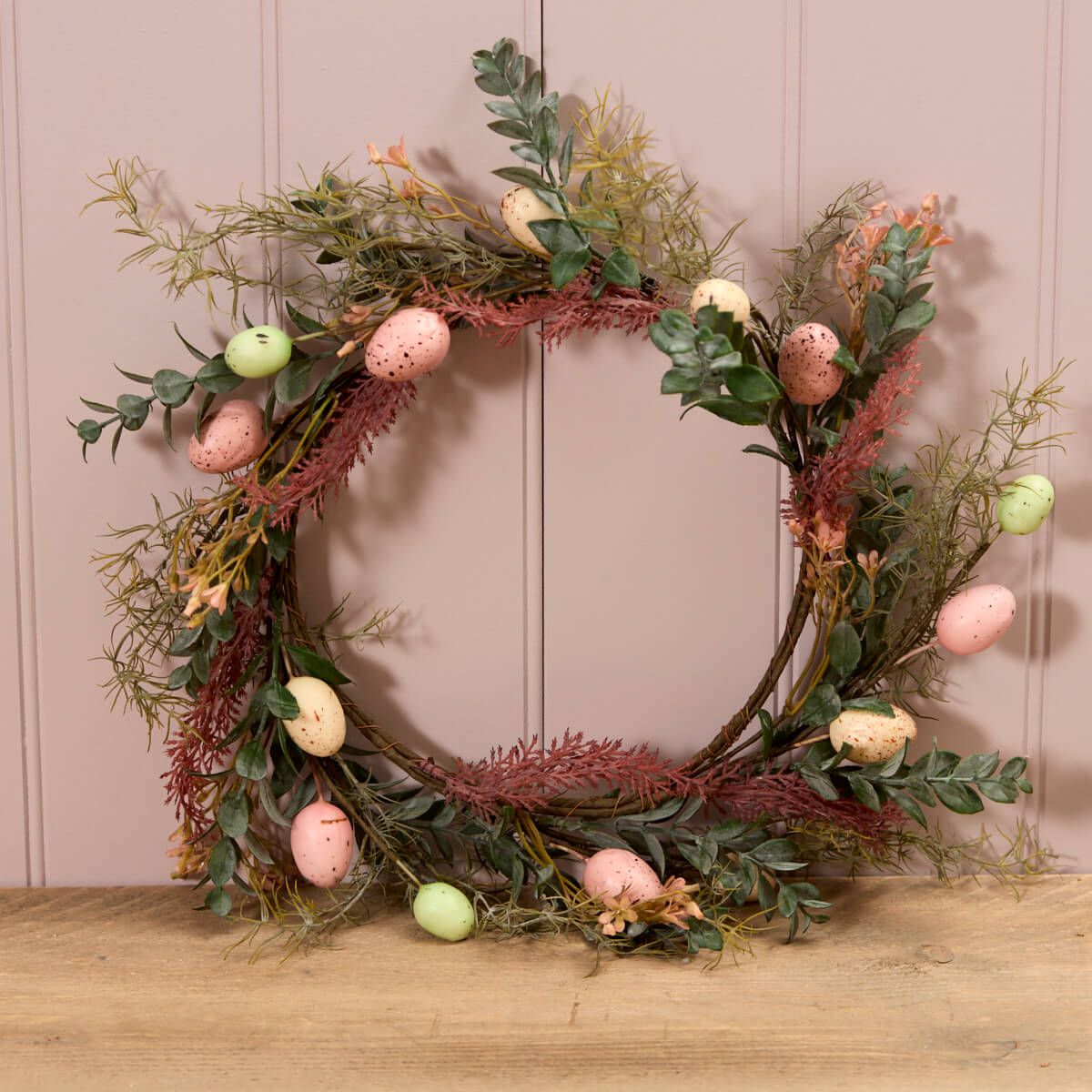 Round wreath constructed from synthetic materials, featuring faux green leaves, artificial brown twigs, pink and light green faux branches, and assorted pastel-colored speckled artificial eggs arranged evenly around the design. So pretty for the Spring season!