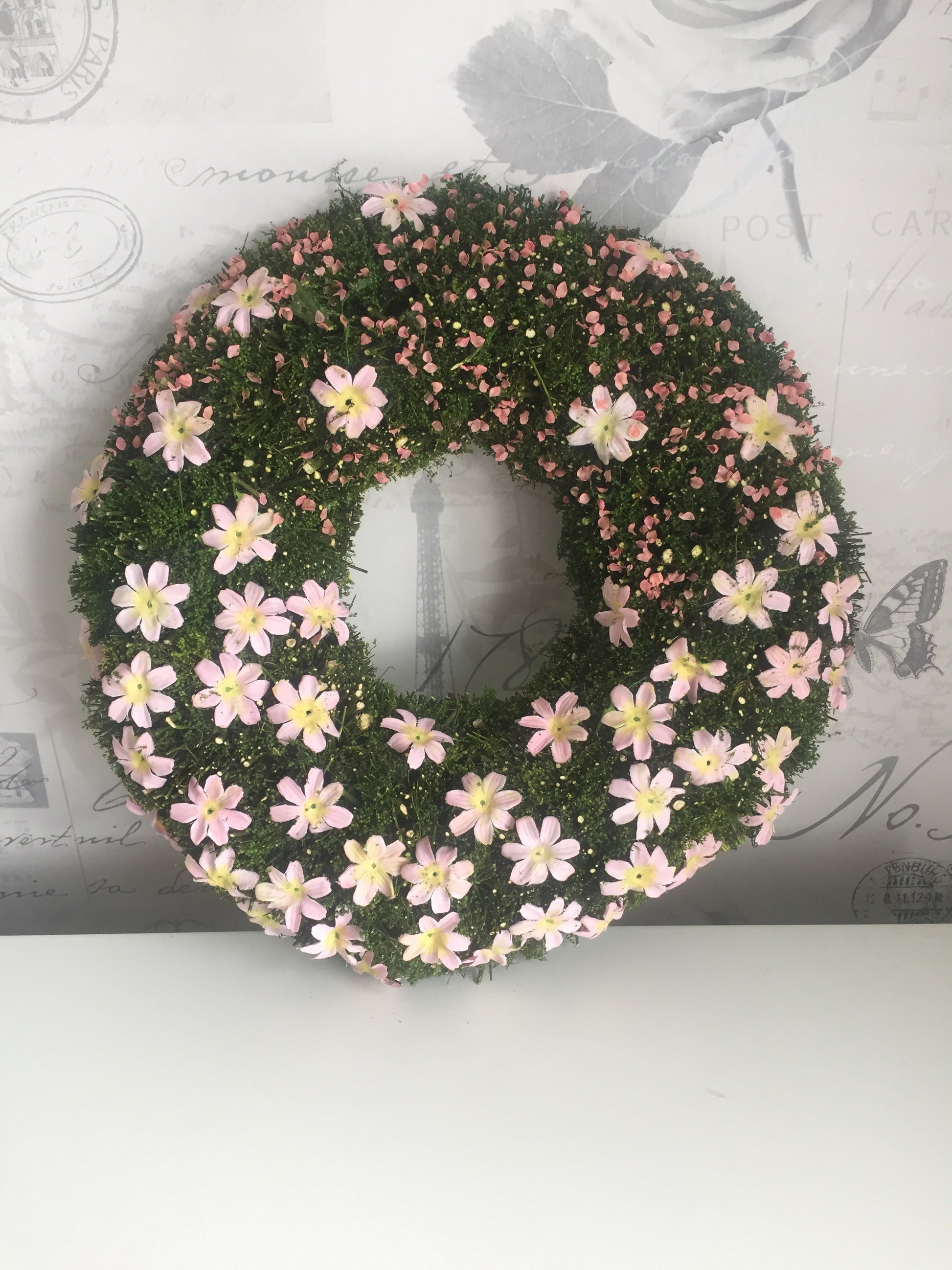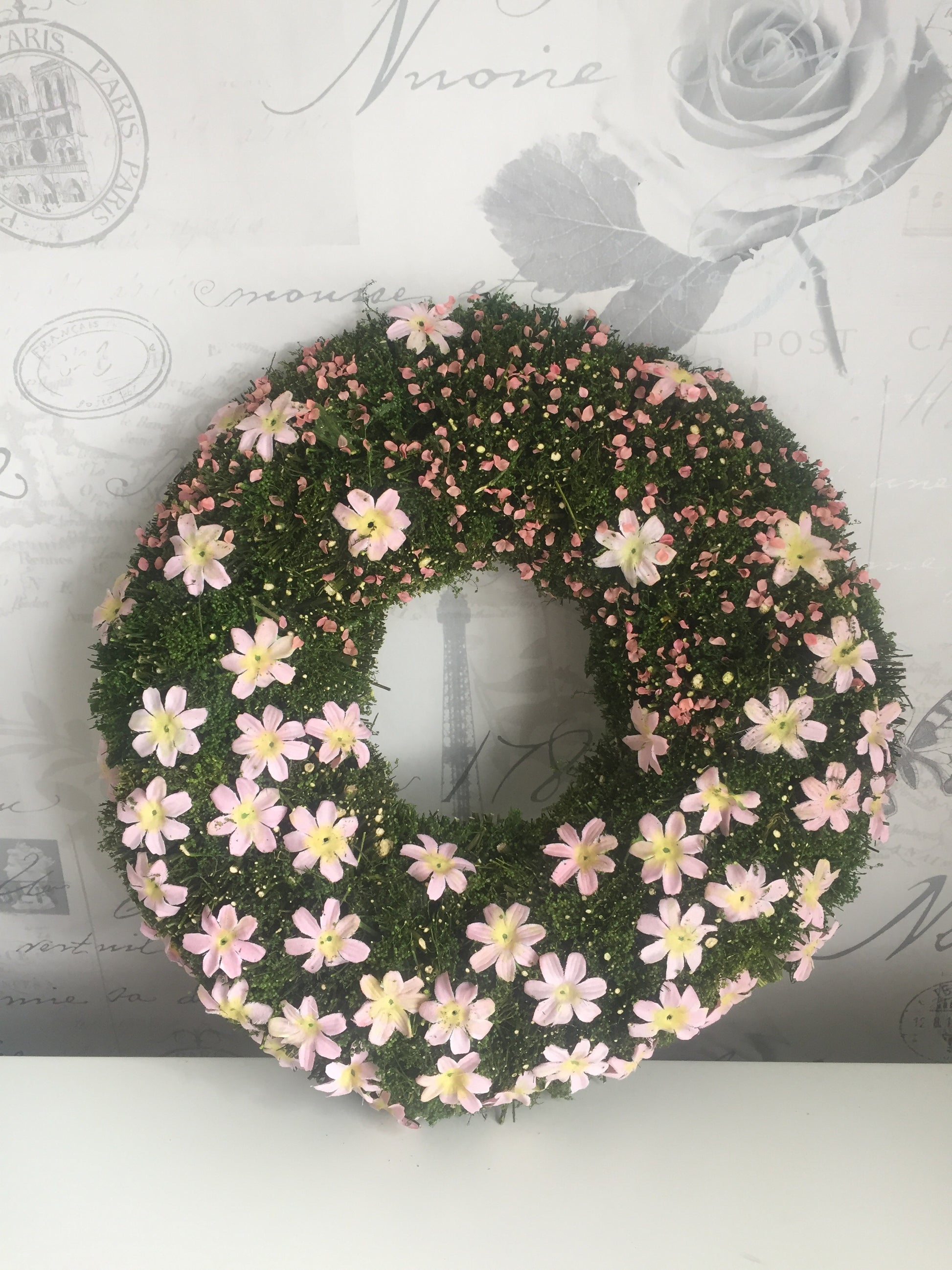 New! Beautiful Easter wreath, covered in faux moss & pretty pink flowers. Comes with small hook on the reverse for hanging.