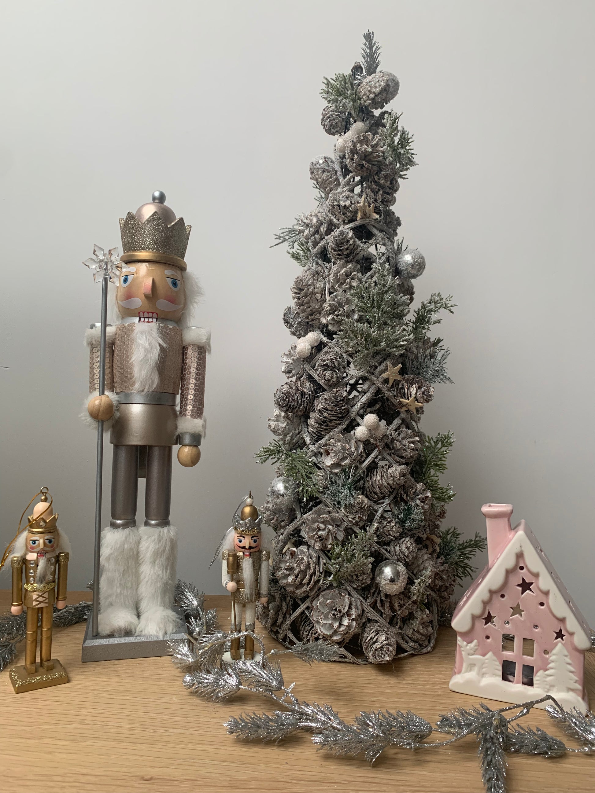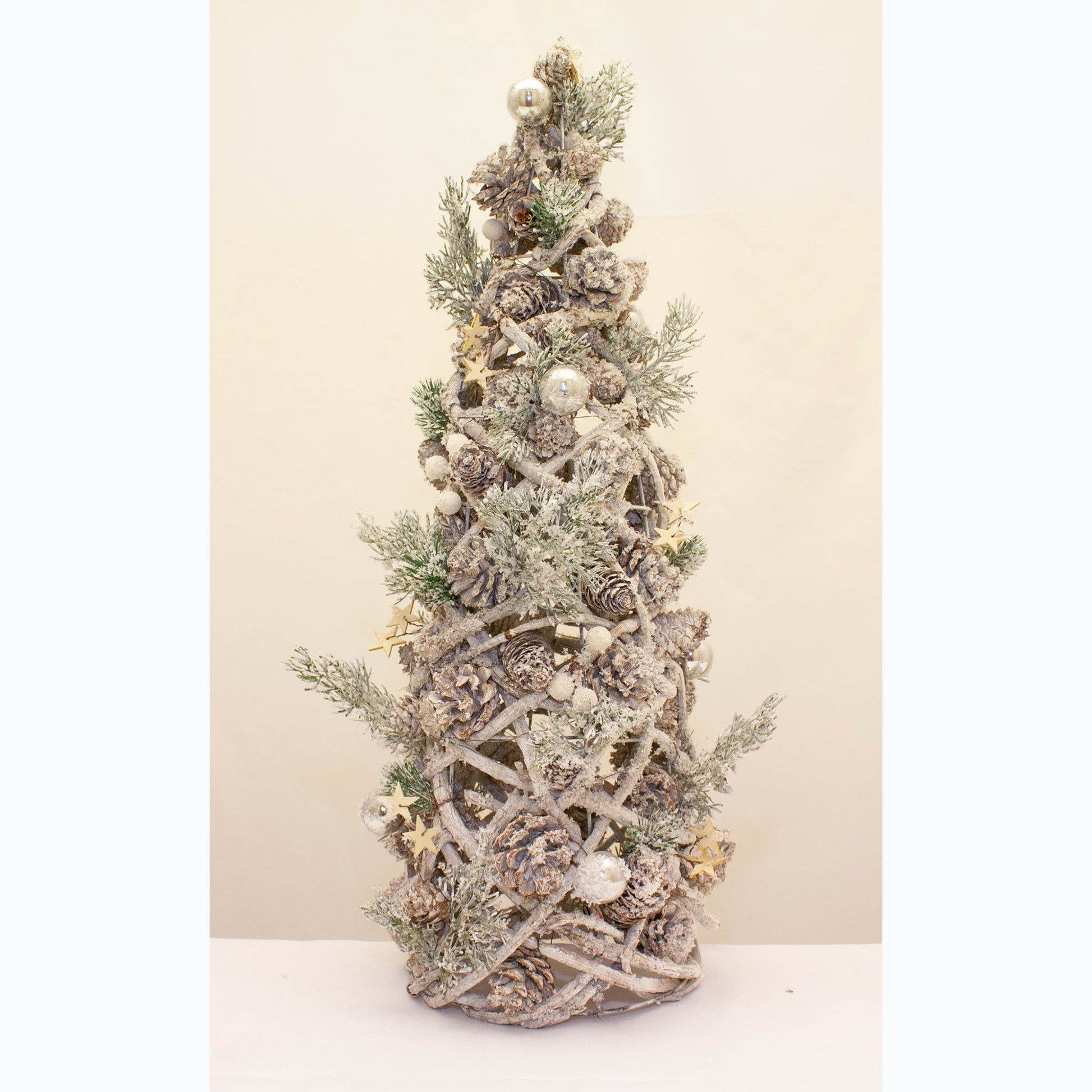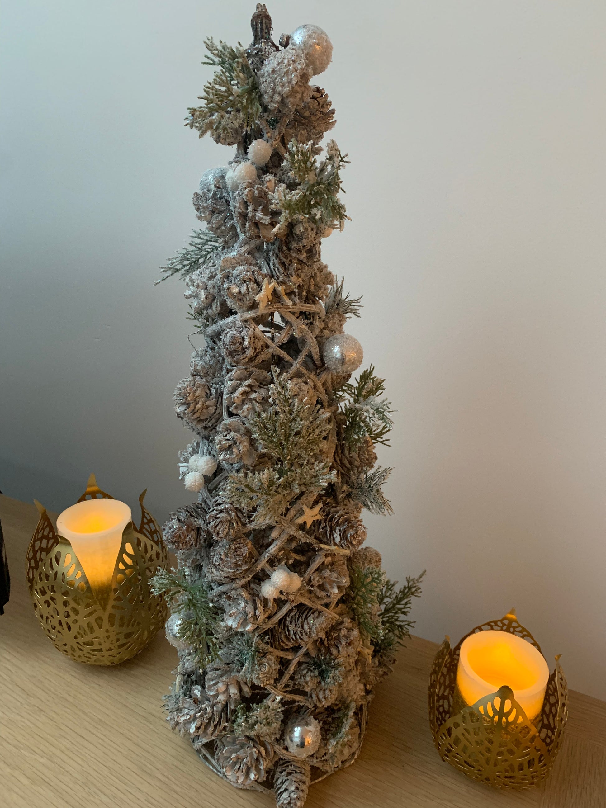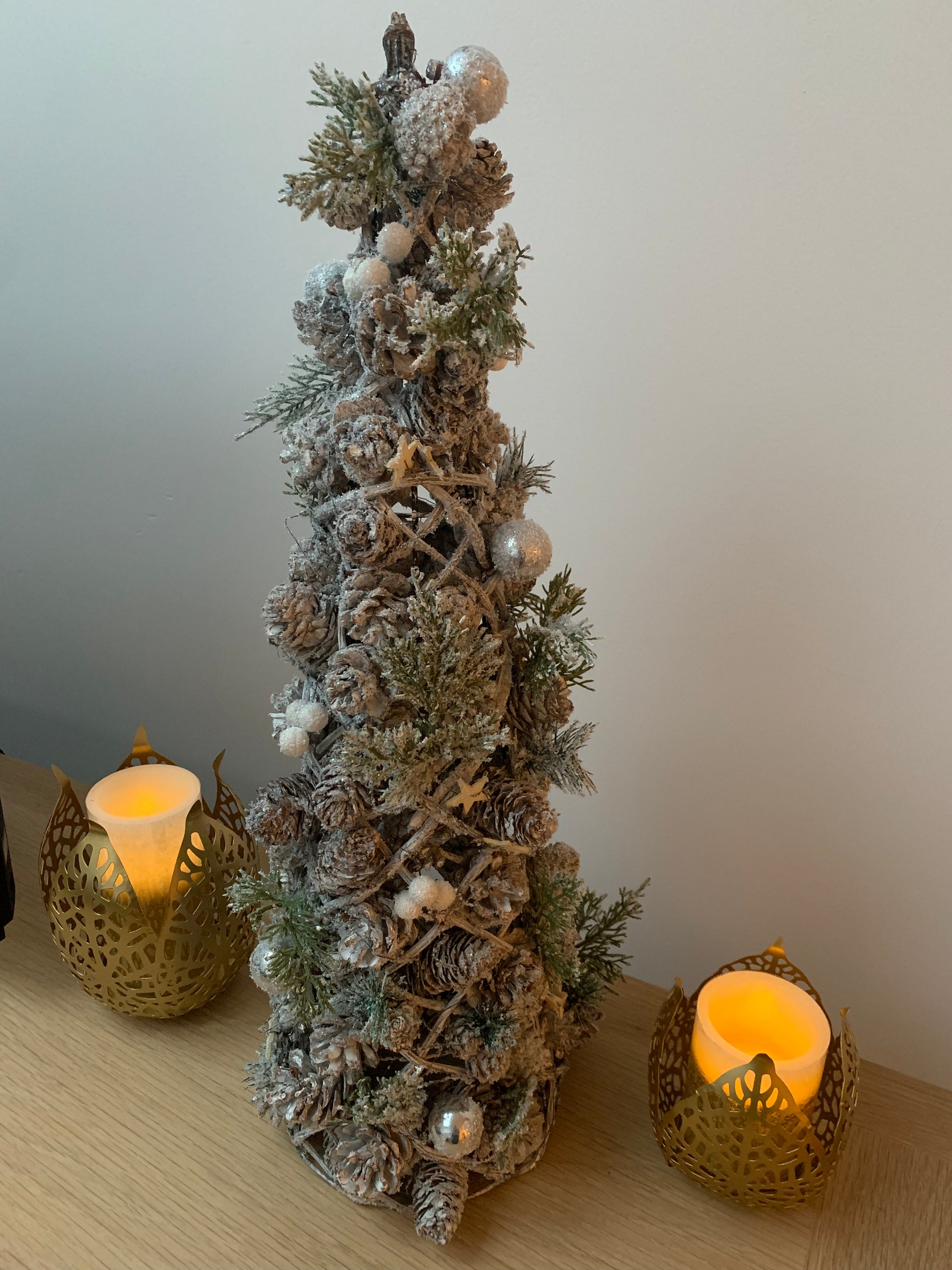 Very pretty conical tree with frosted effect in neutral colours, decorated with pinecones and green foliage, understatedly beautiful. Perfect for a more natural themed Christmas. We have ours up already!