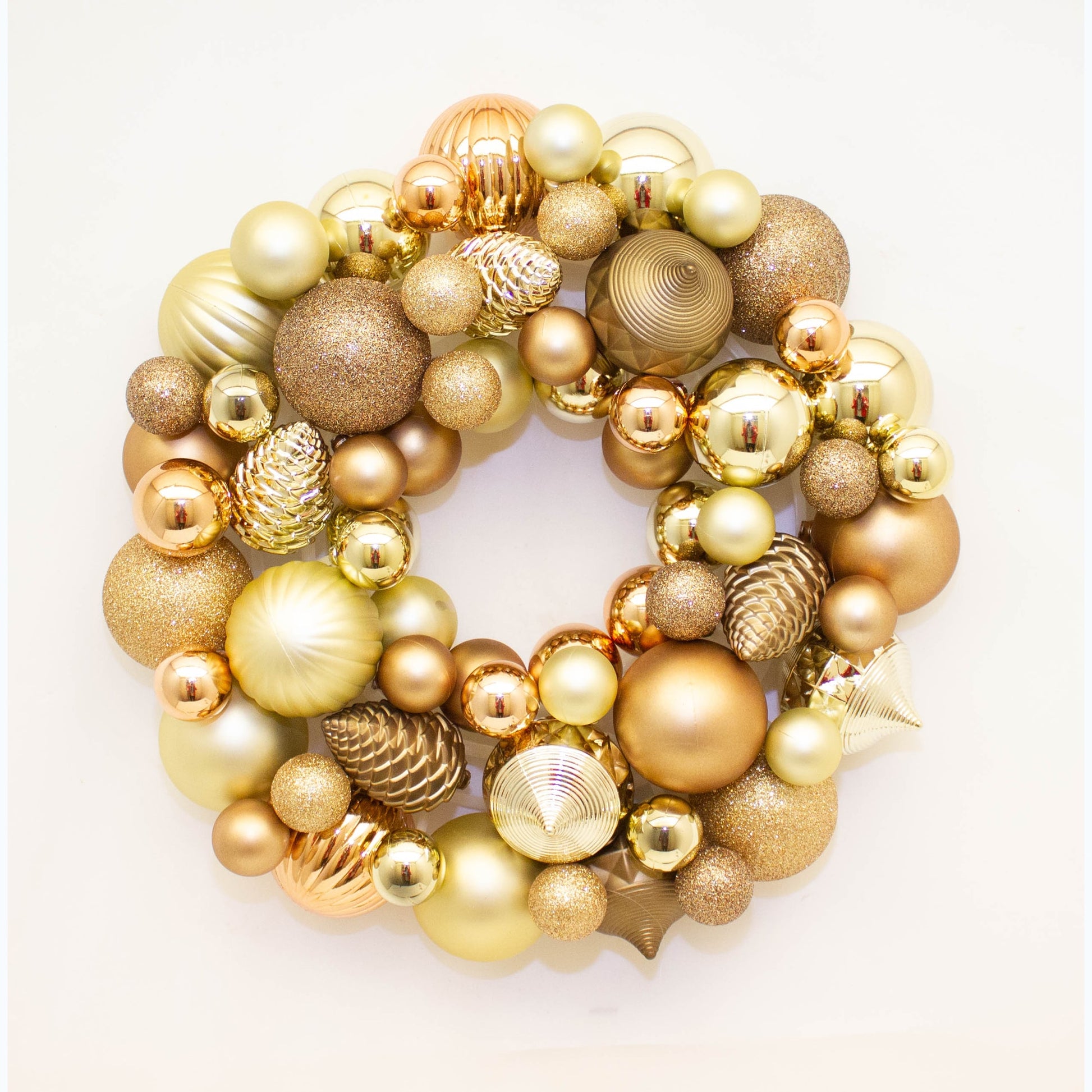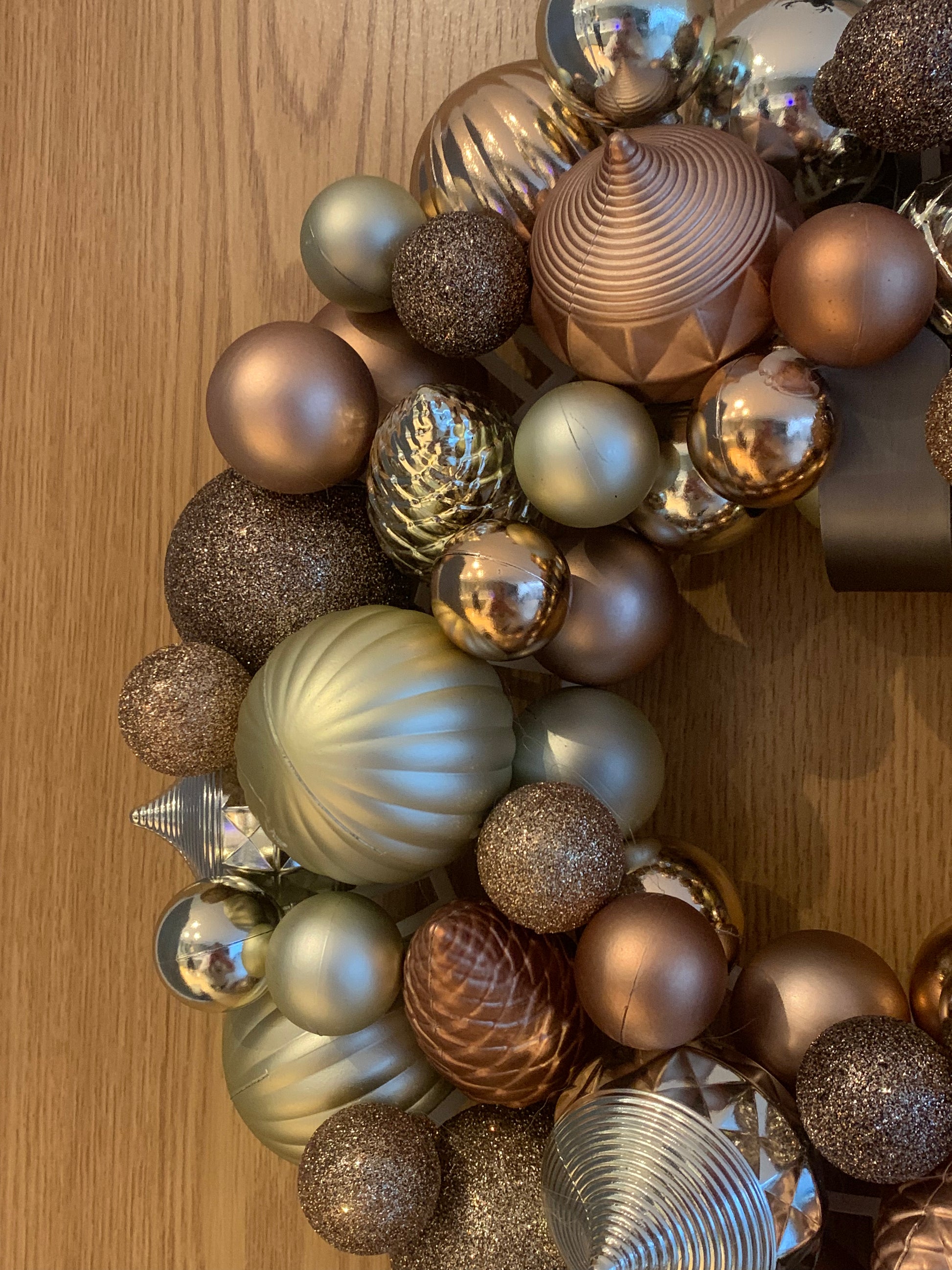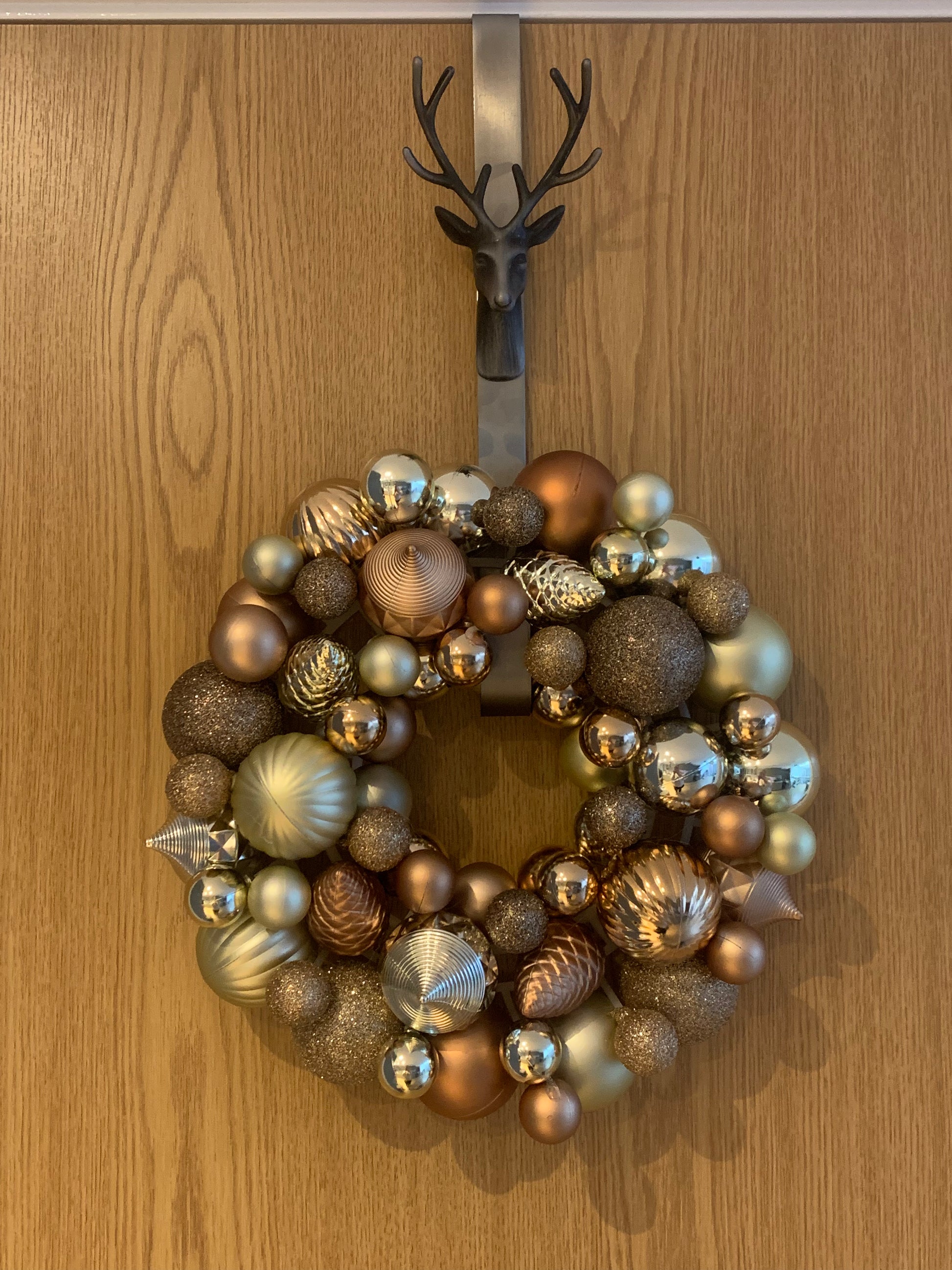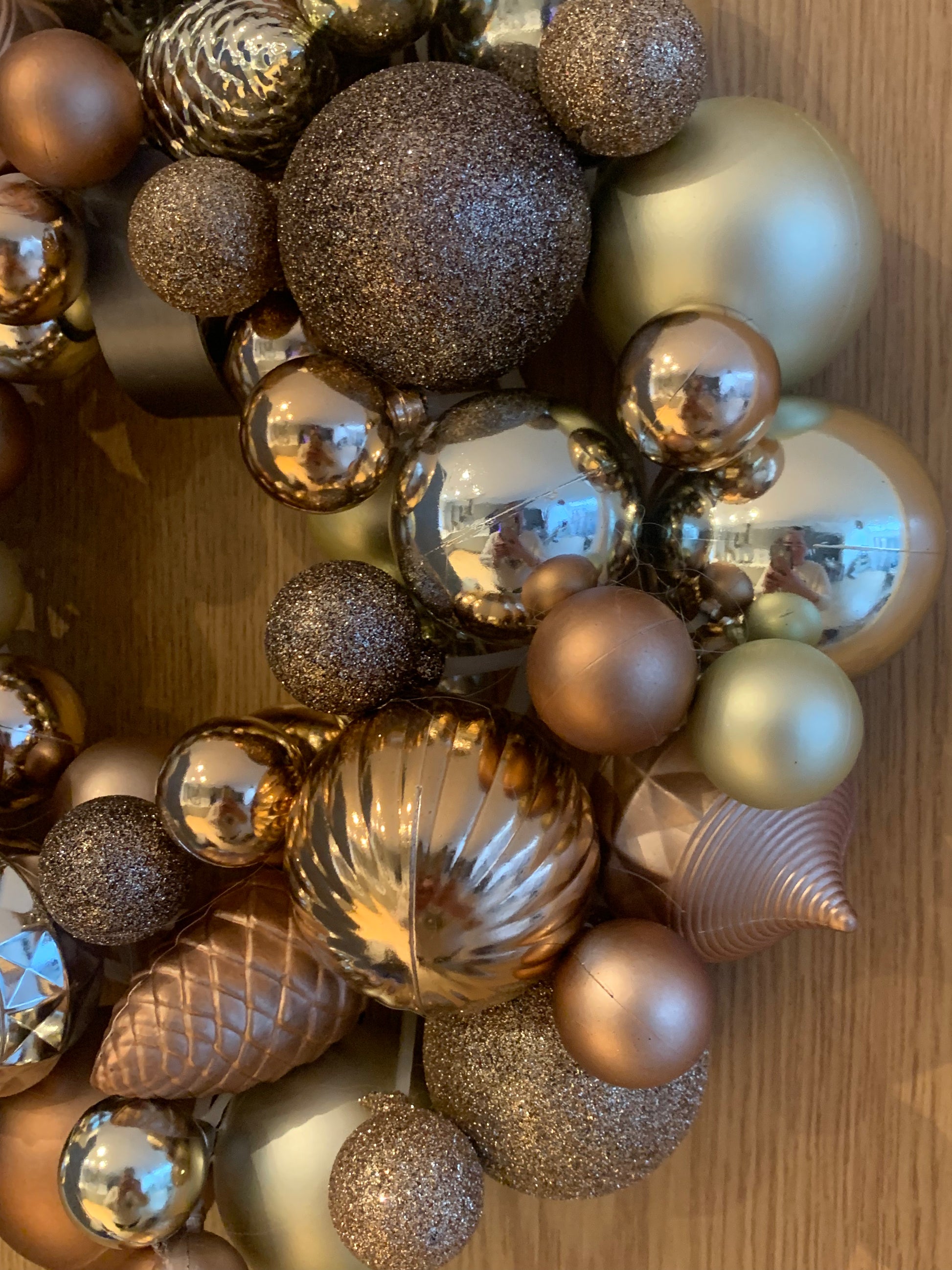 Such a glamorous wreath decorated entirely in gold baubles of all slightly different shades, love it! We have ours on our living room door & it looks stunning!