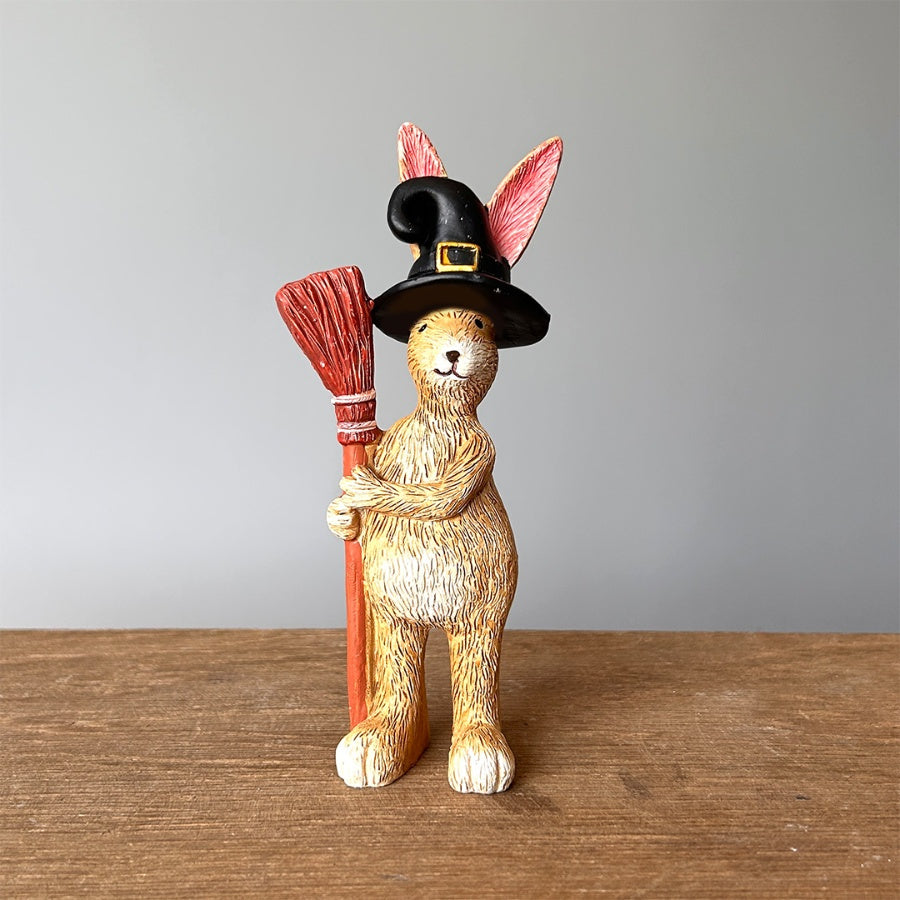 A halloween themed rabbit decoration featuring witches hat and broom details.