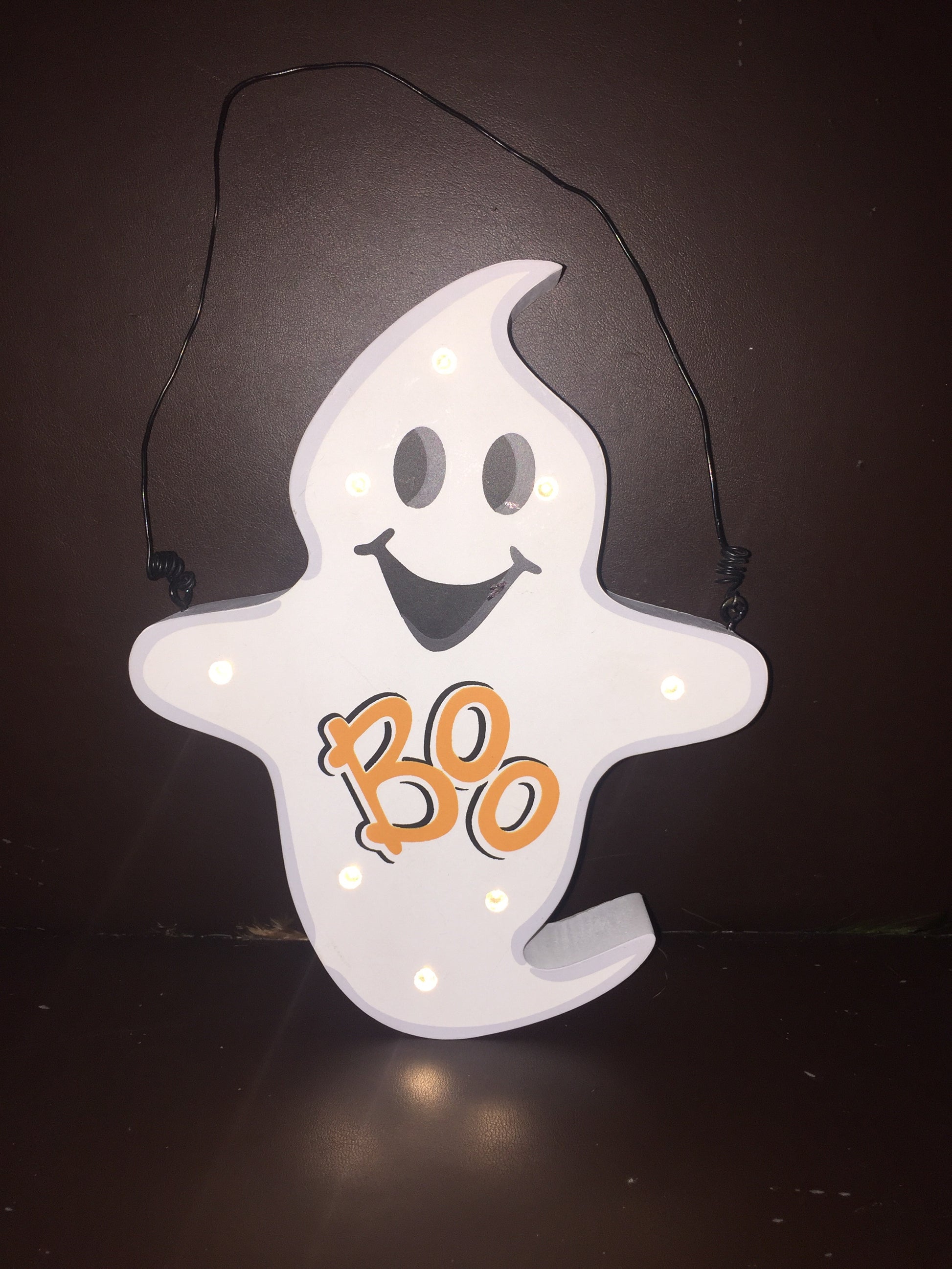 There is nothing better to hang up during the Halloween season than our wooden ghost plaque complete with small LED lights. Boo!