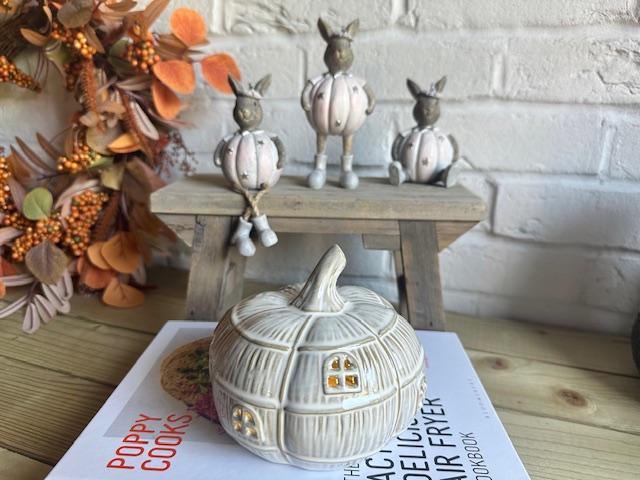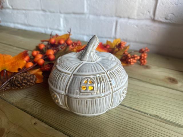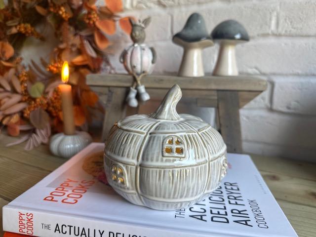 An enchanting LED house in a pumpkin shape. Complete with a reactive glaze finish.