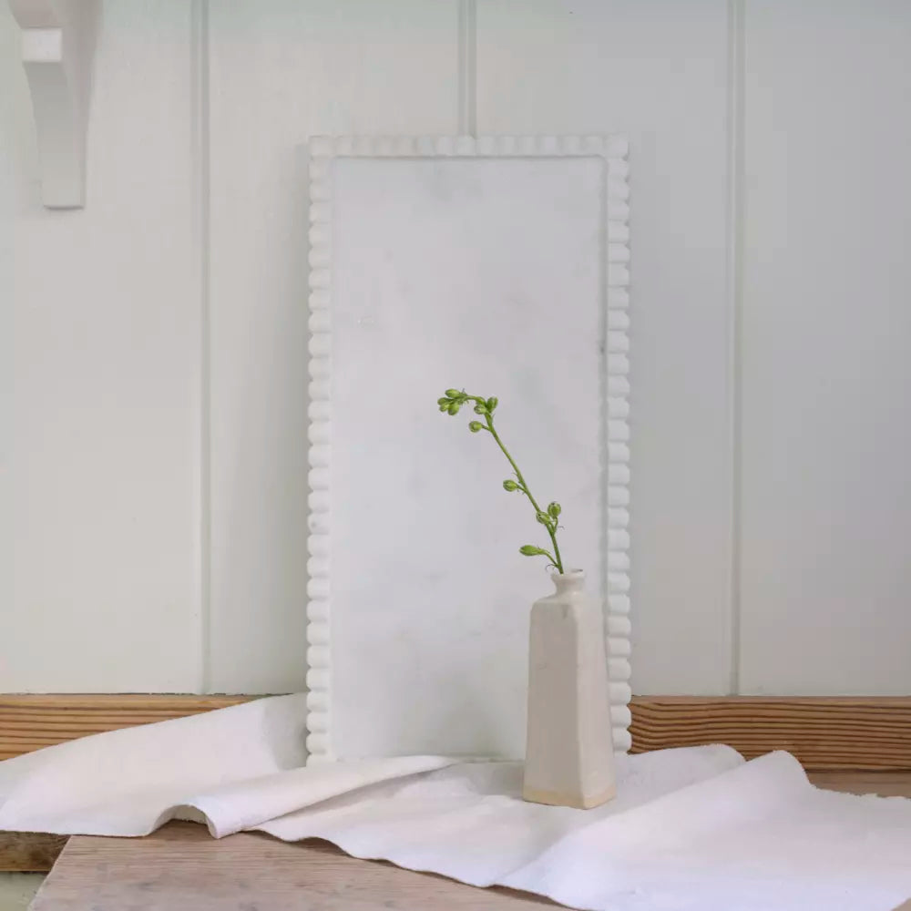 This is an elegant marble tray featuring a sleek rectangular design. The tray is accented with a decorative border of small, rounded marble beads that add texture and visual interest. Perfect for serving or display purposes, it combines functionality with sophisticated style, making it an ideal addition to your home decor or entertaining space. Its durable marble construction ensures longevity and a touch of luxury.