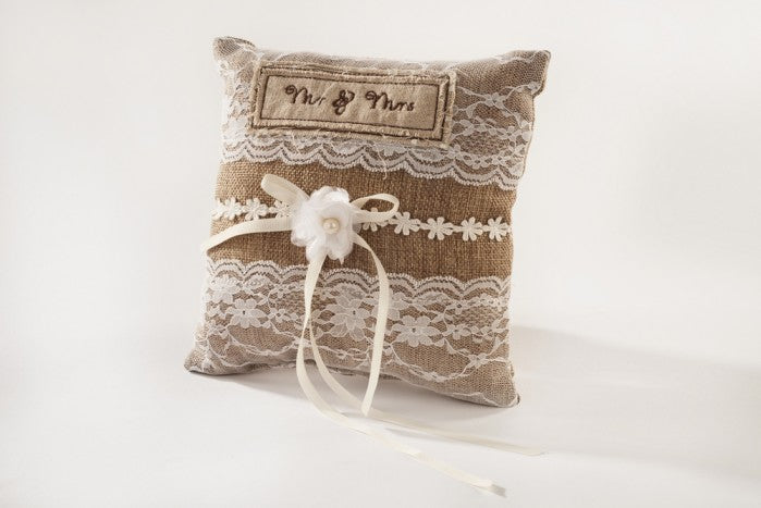 Hessian cushion with lace design and ribbon rose