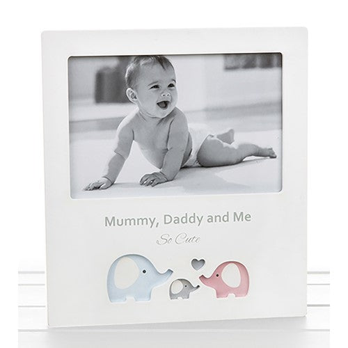 White photo frame with a 3 elephant design, all ready to take your photo of Mummy, Daddy & Me!