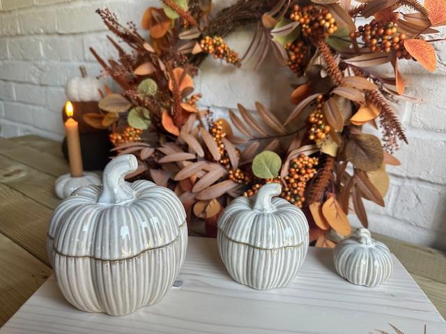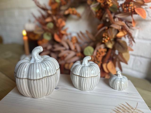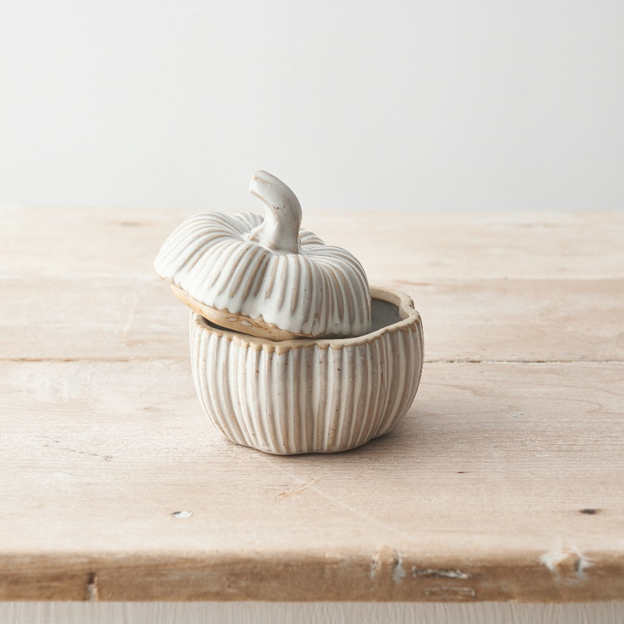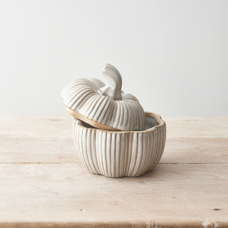 A ceramic pot shaped as a pumpkin with a natural colour scheme and striped detailing.