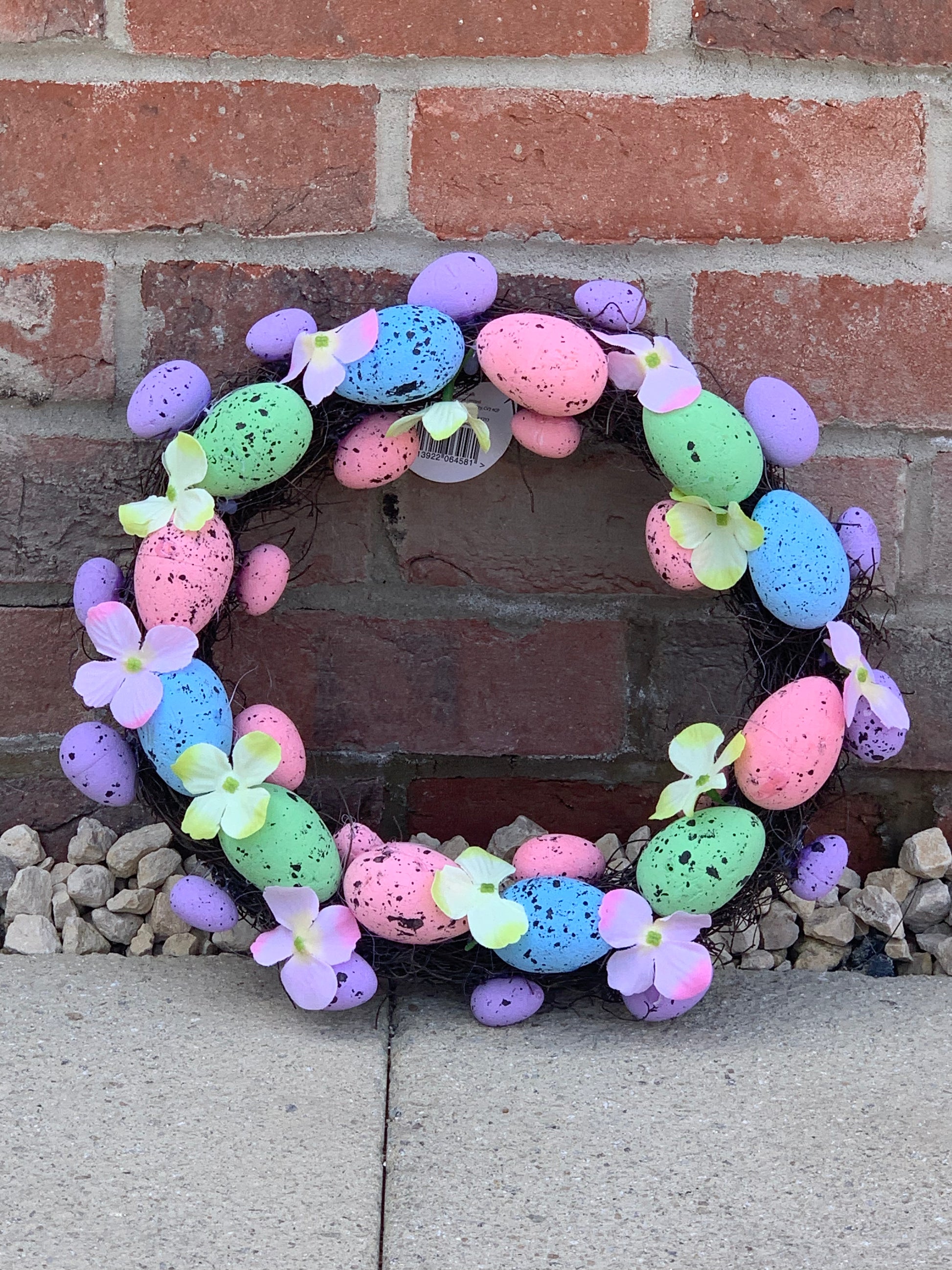 Cute soft twig wreath for the Spring & Easter season in gorgeous brights of pink, purple & green with decorative flowers