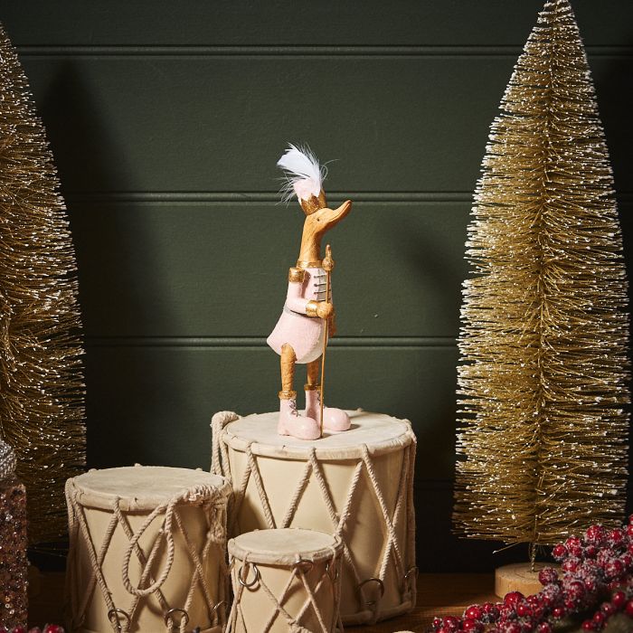 Nutcracker duck ornament made of resin, wearing a pink outfit with gold accents, pink boots, and a gold crown with a white feather. The duck is holding a staff and features painted detailing throughout the figure.