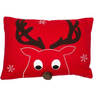 Red felt plush cushion with Prancer's head and brown pom pom nose.