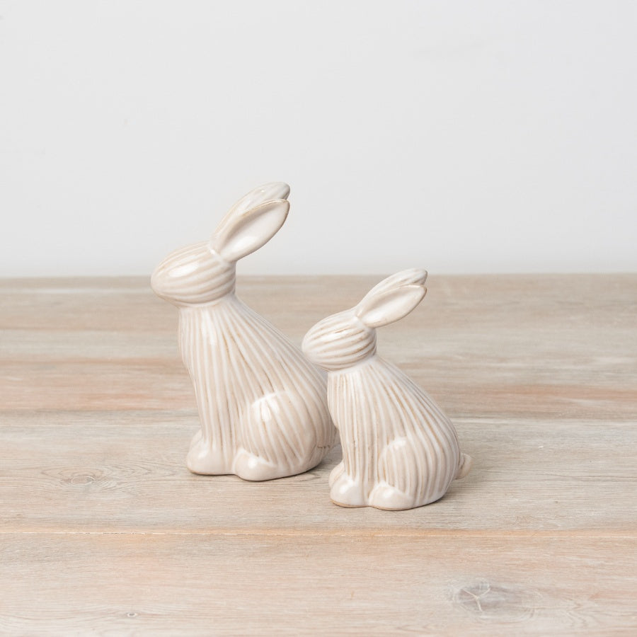 Set of 2 chic bunny ornaments with a glazed ribbed finish in natural colours.