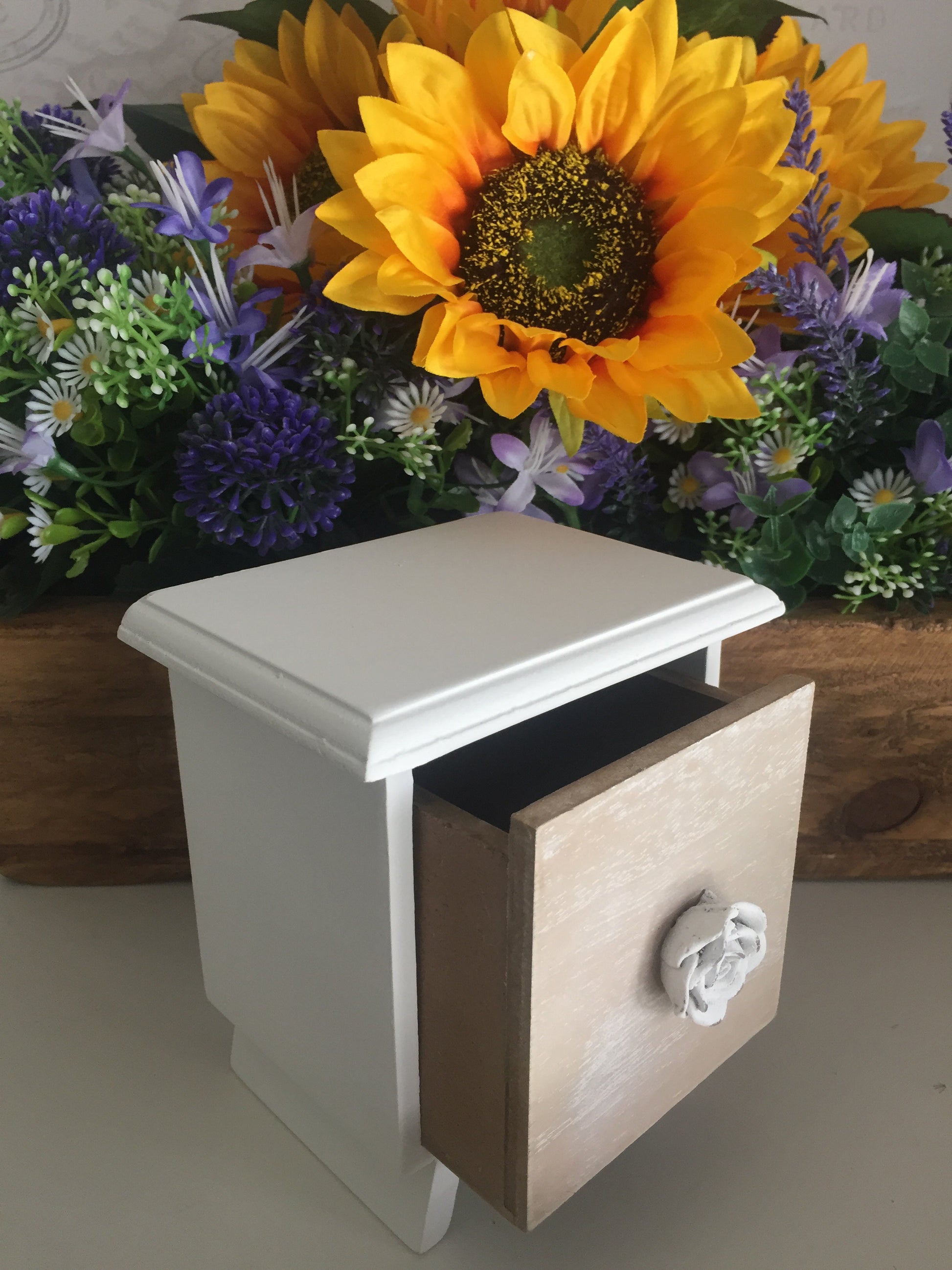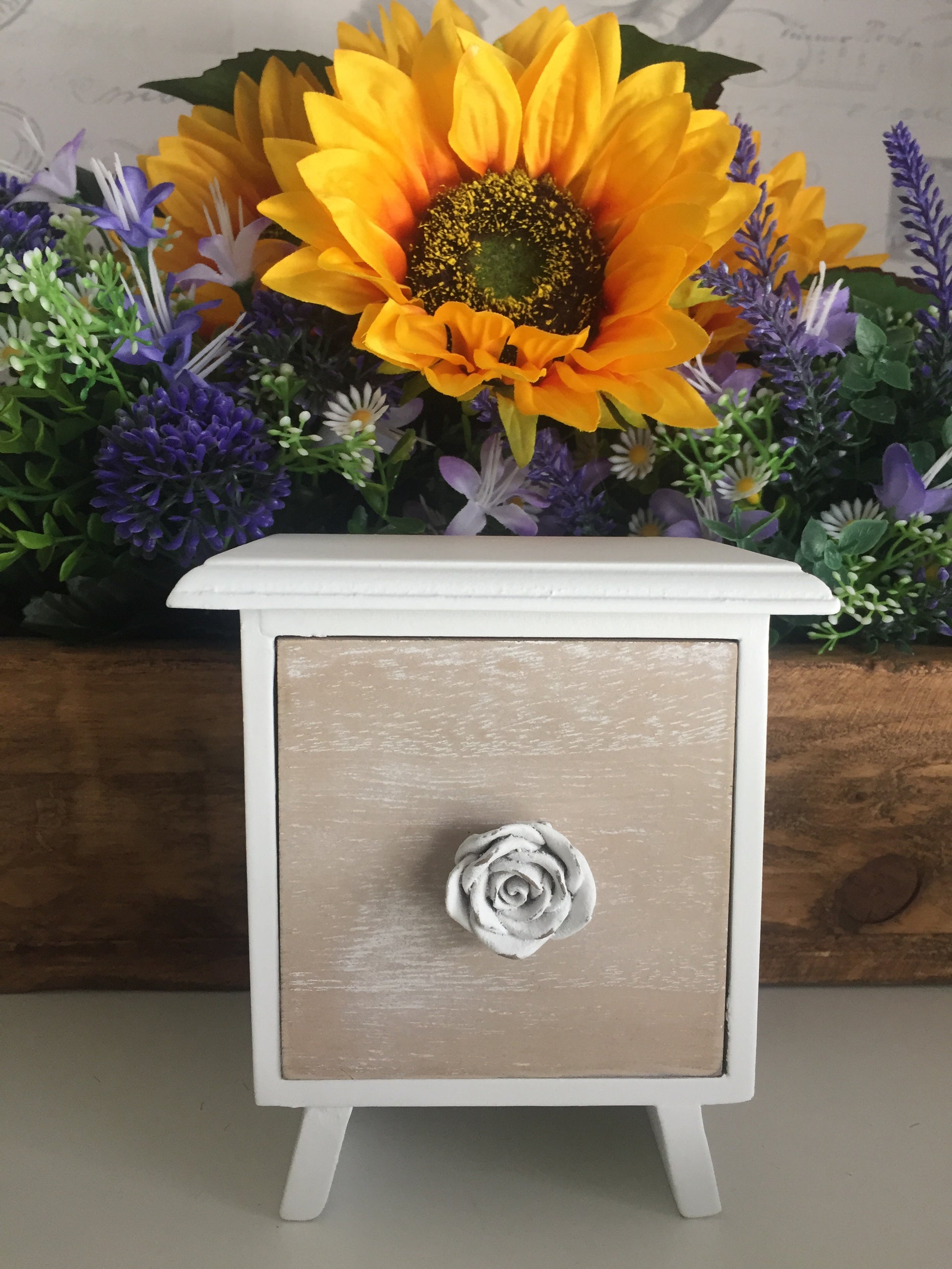 Shabby chic distressed style mini chest with single drawer and rose handle. Ideal for a hall table or dressing table for all those little trinkets.