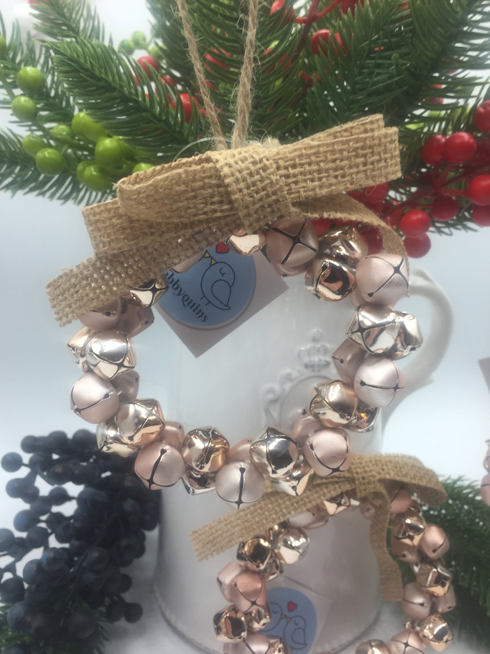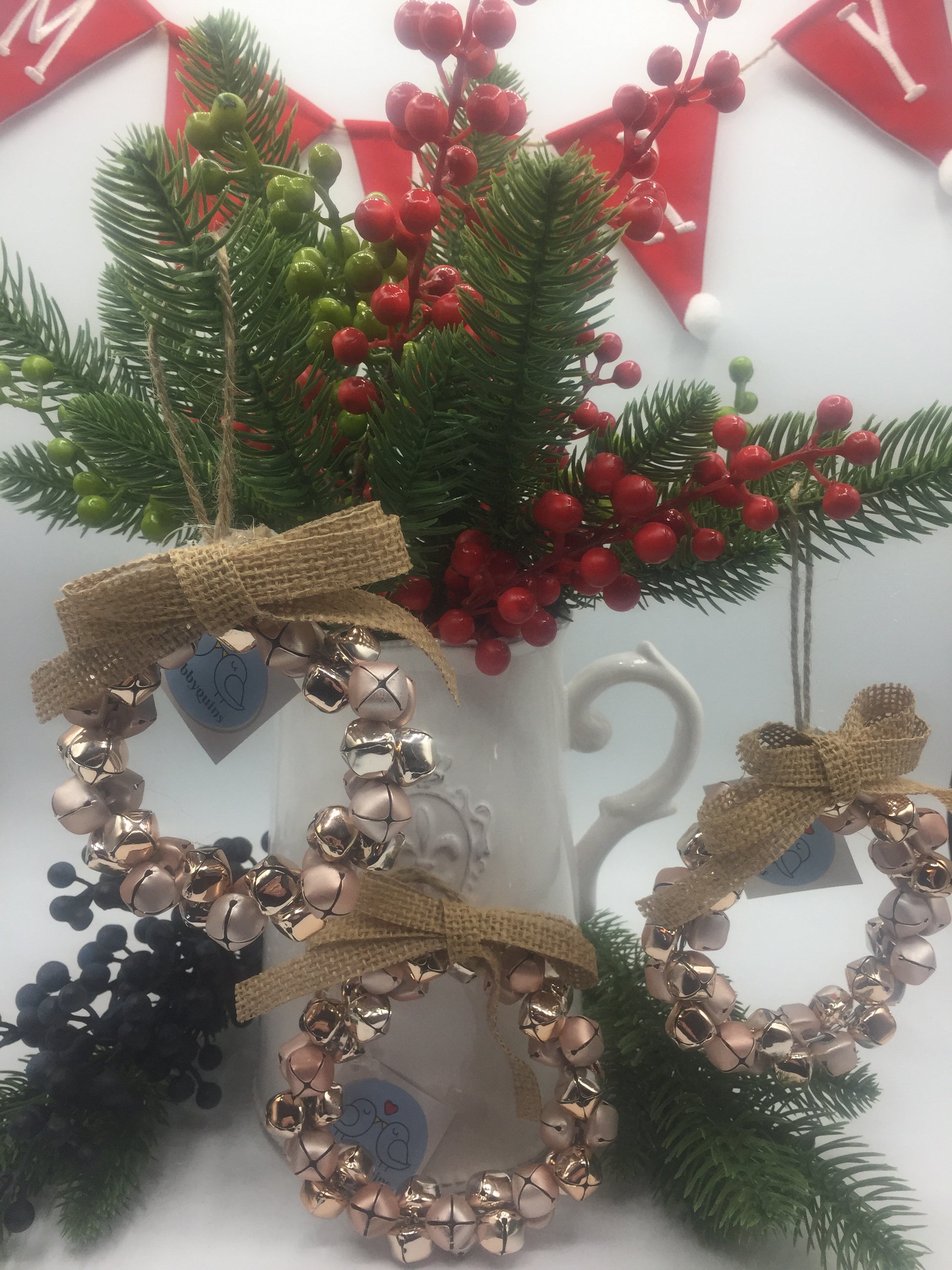 Very festive mini Christmas wreath made a from bronze bells complete with hessian bow and hanger.