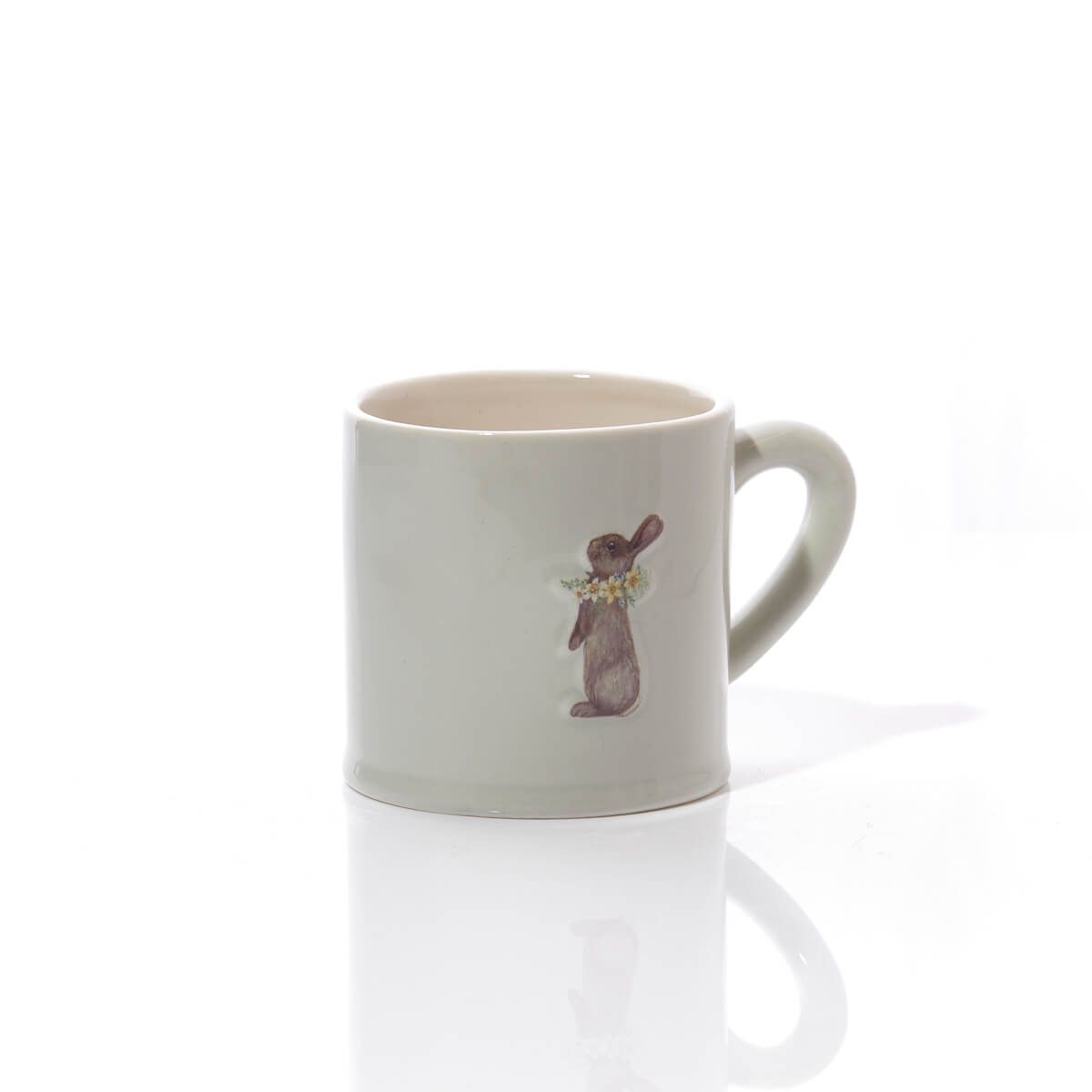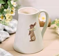 Stoneware jug in a light neutral color featuring an embossed rabbit design with flowers around its neck and a smoothly curved handle.