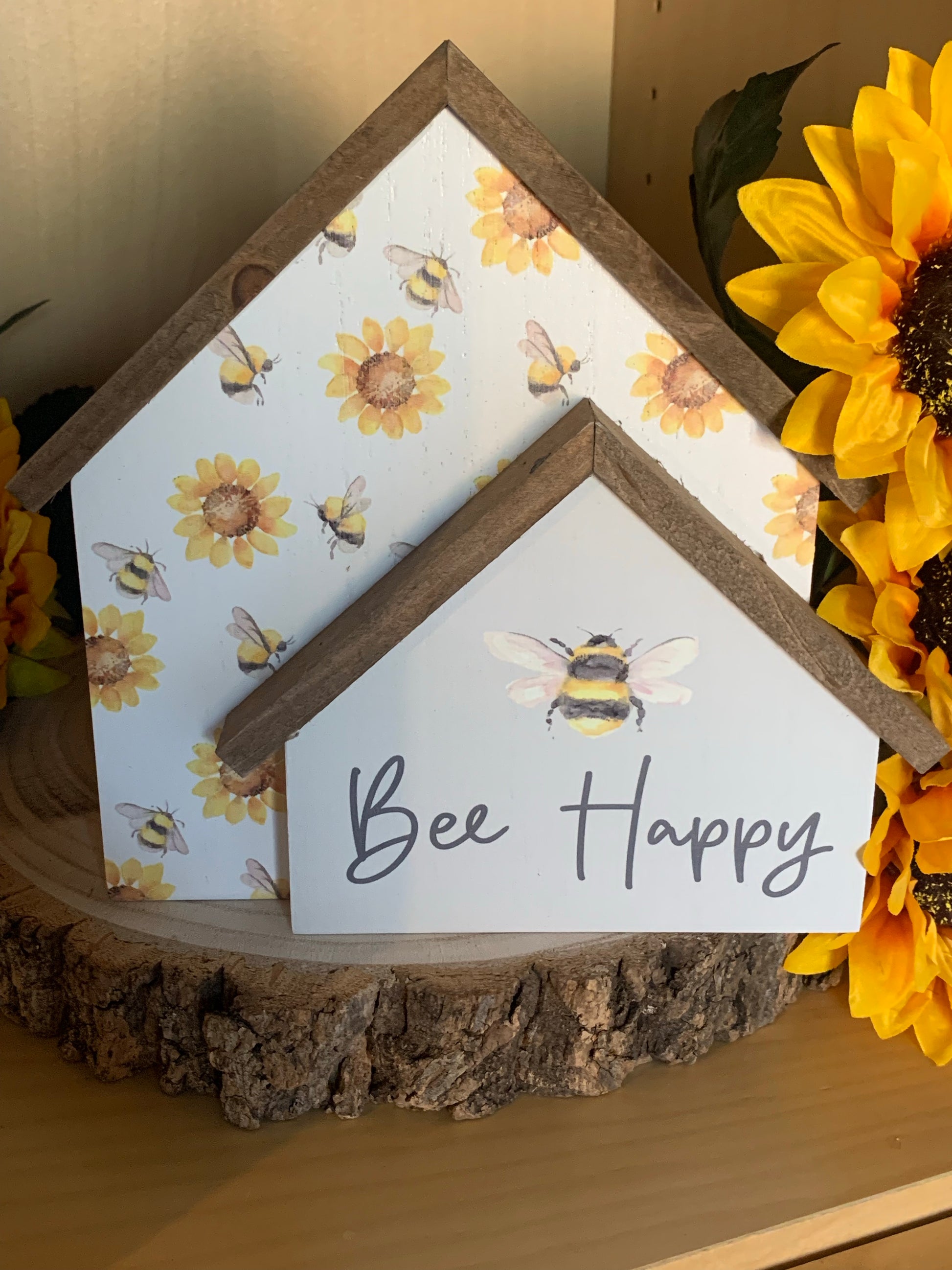 Bee Happy and enjoy displaying our gorgeously Spring-like wooden Double House Block.
