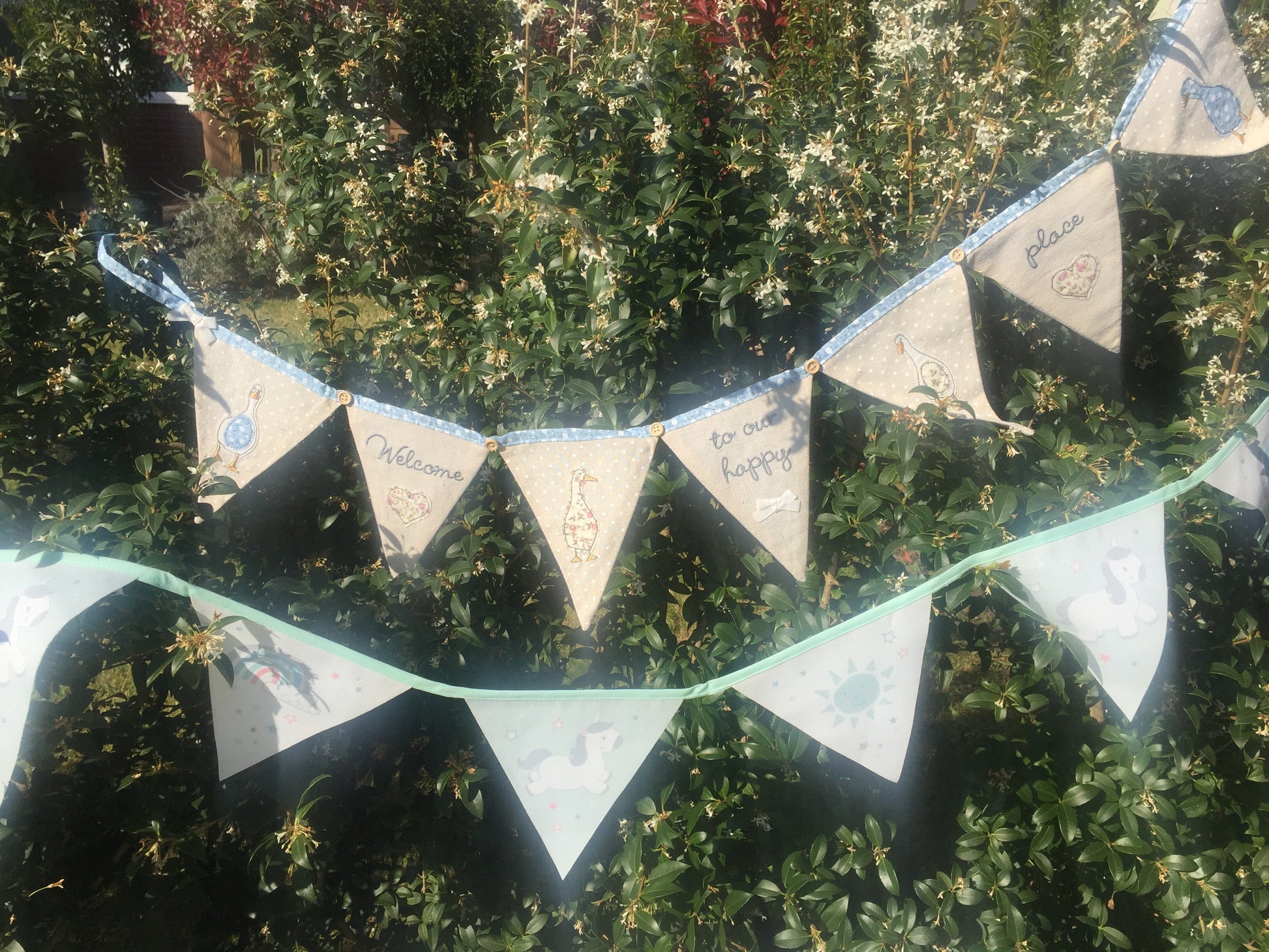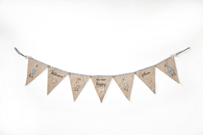 Perfectly spring-like, welcome guests to your home over the Easter season and beyond with this lovely Welcome To Our Happy Place Bunting featuring a blue spotted border with different colour ducks