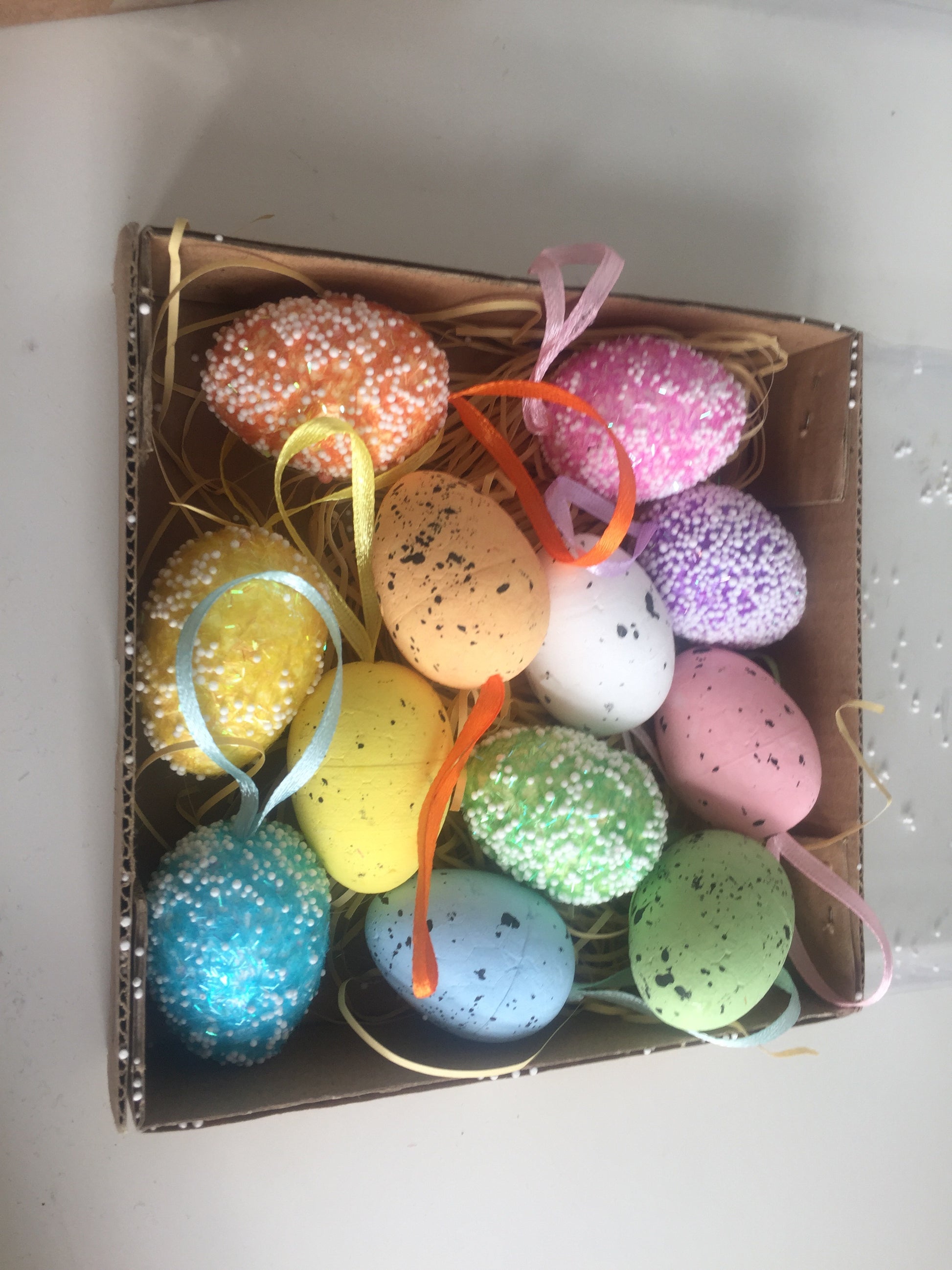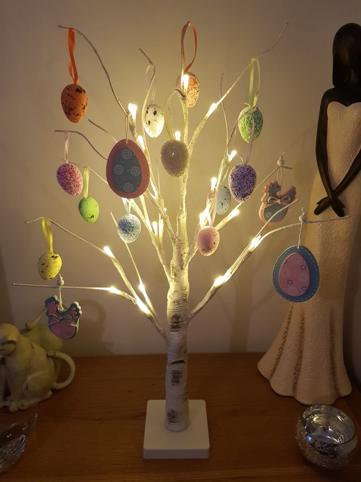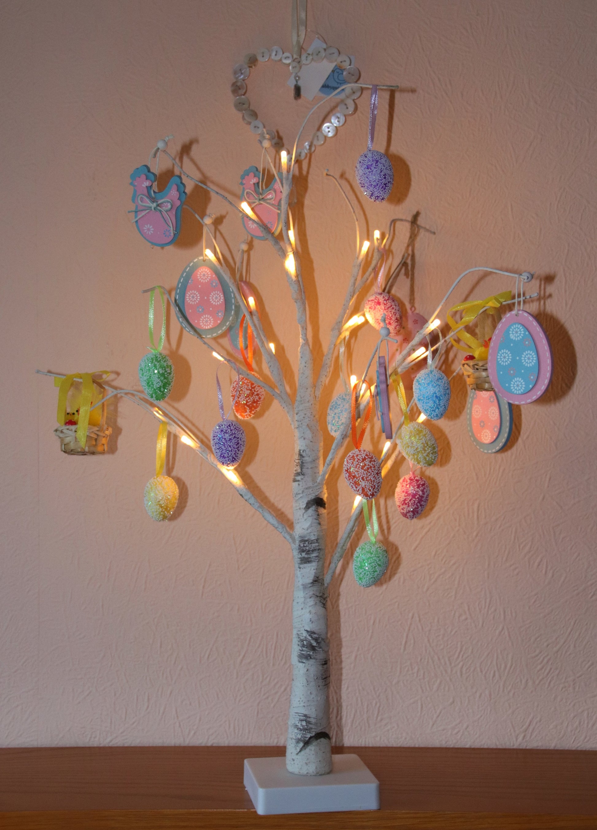 Tree has battery operated lights. Box of 12 assorted eggs, approximately half pastel colours & half glittery/brights. Colours may vary