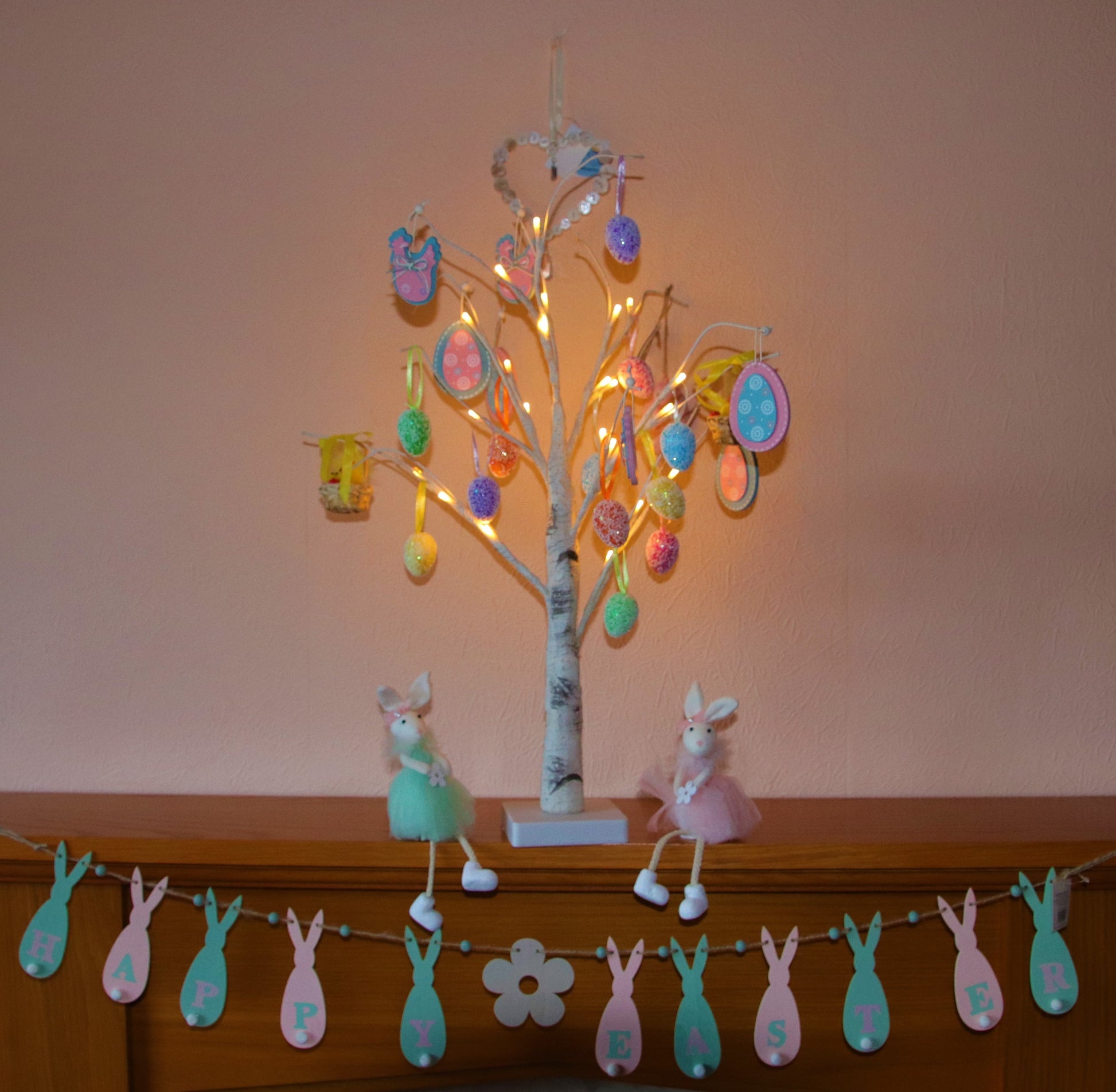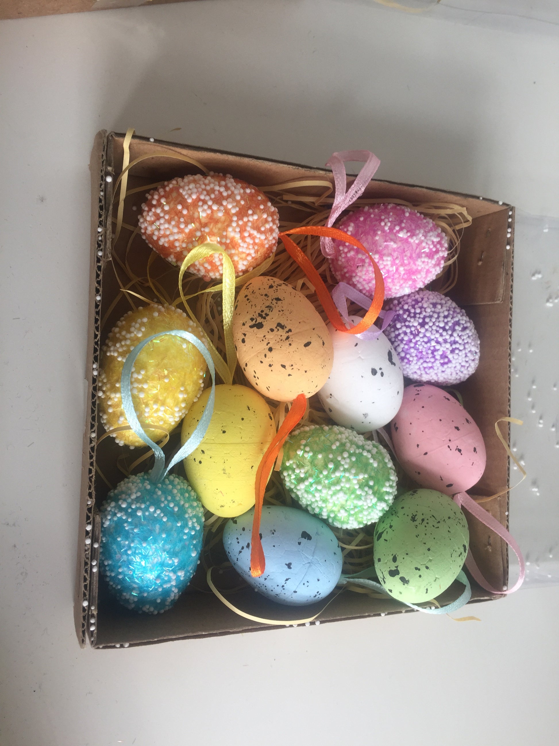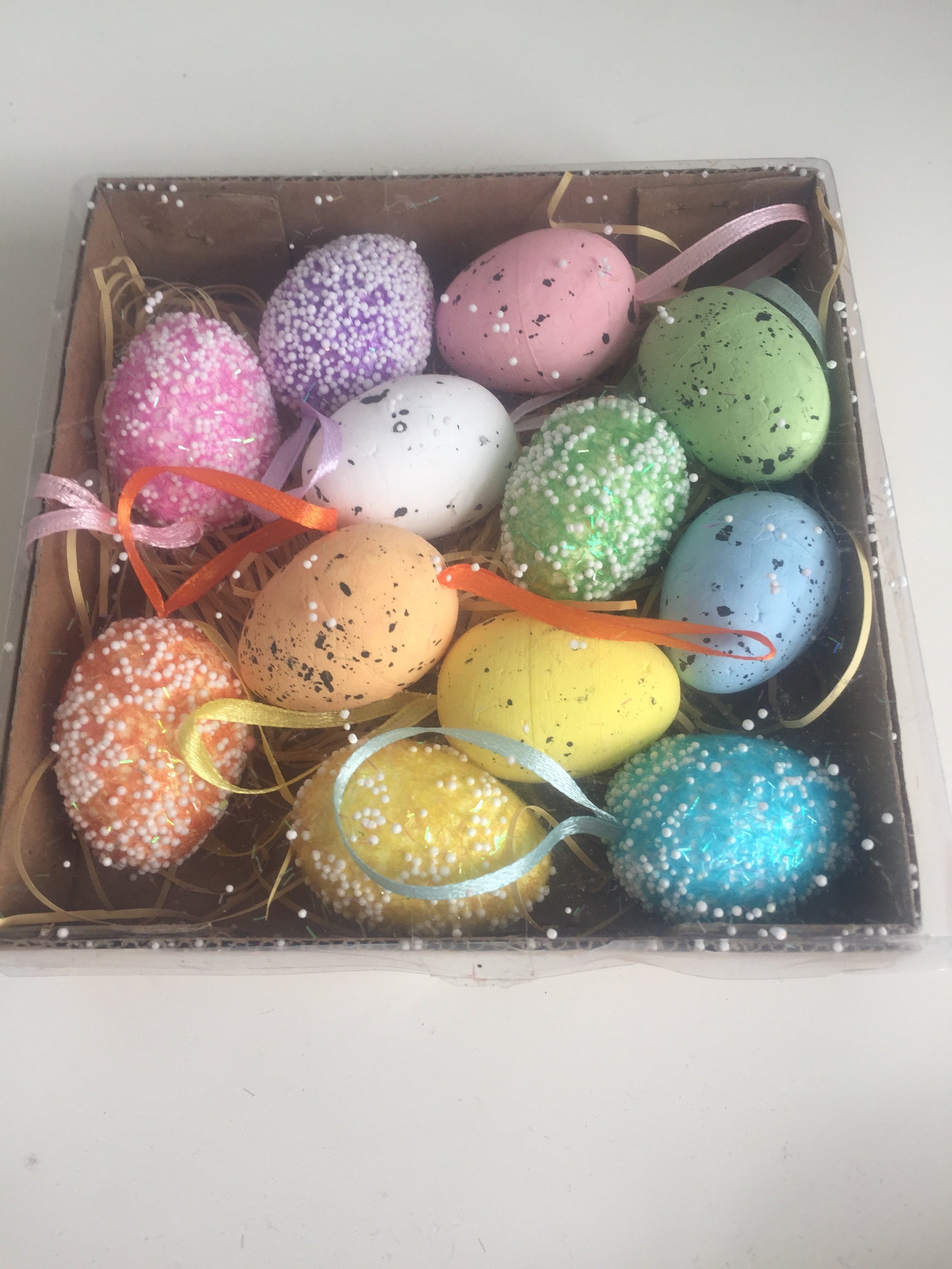 Tree has battery operated lights. Box of 12 assorted eggs, approximately half pastel colours & half glittery/brights. Colours may vary
